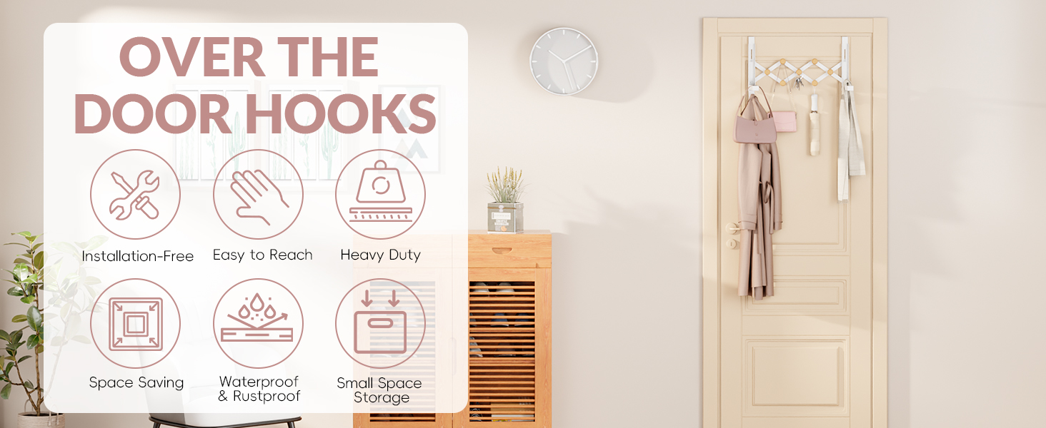 No installation required: The over the door hooks for hanging requires no mounting or drilling; simply hook it over the top of any standard door. This door hanger hook fits most doors and comes with anti-scratch protective pads, so it will not scuff your door's finish. It can be conveniently removed at any time, takes up little space, and is perfect for travel