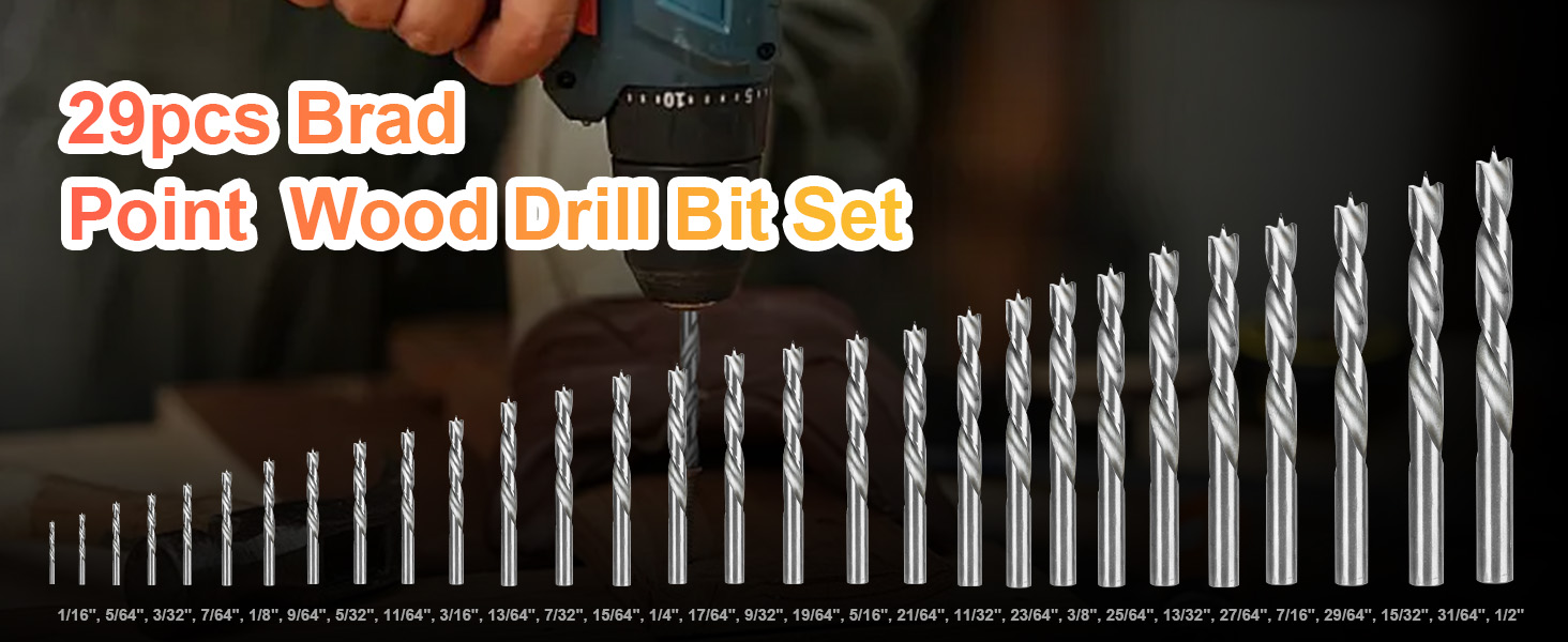 29Pcs Brad Point Wood Drill Bit Set, HSS Double Flutes 1/16" to 1/2", Standard Shank with Metal Index Storage Case, Brocas para Madera for All Wood Types Woodworking