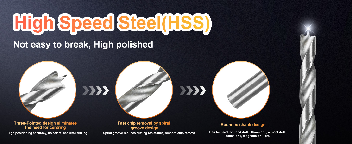 Durable HSS Build:Crafted from premium high-speed steel for exceptional toughness and break resistance, long-lasting cutting performance even on hard wood. Universal round shank fits most power tools, including cordless drills, impact drills, bench drills, magnetic drills and hand drills for versatile use.