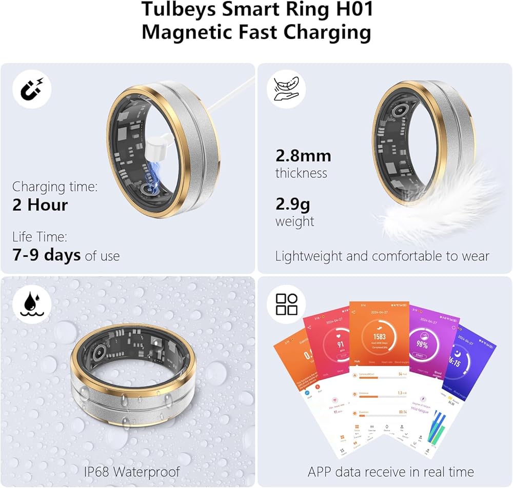 Smart Ring Health Tracker for Women Men, Heart Rate/Blood Oxygen/Sleep Tracker/Step Counter, Fitness Ring with Magnetic Charging Case, 5ATM Waterproof for iOS & Android, No Subscription Fee- Gold 11