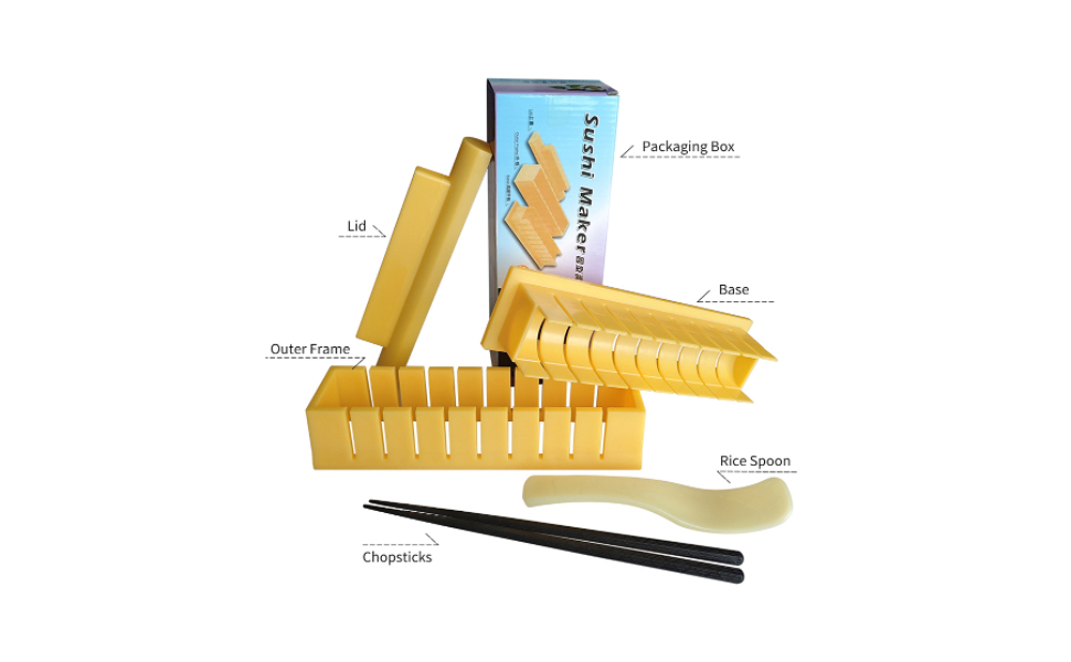 - There are totally 5 parts of this sushi maker. Including out frame, base, lid, rice spoon, and chopsticks.