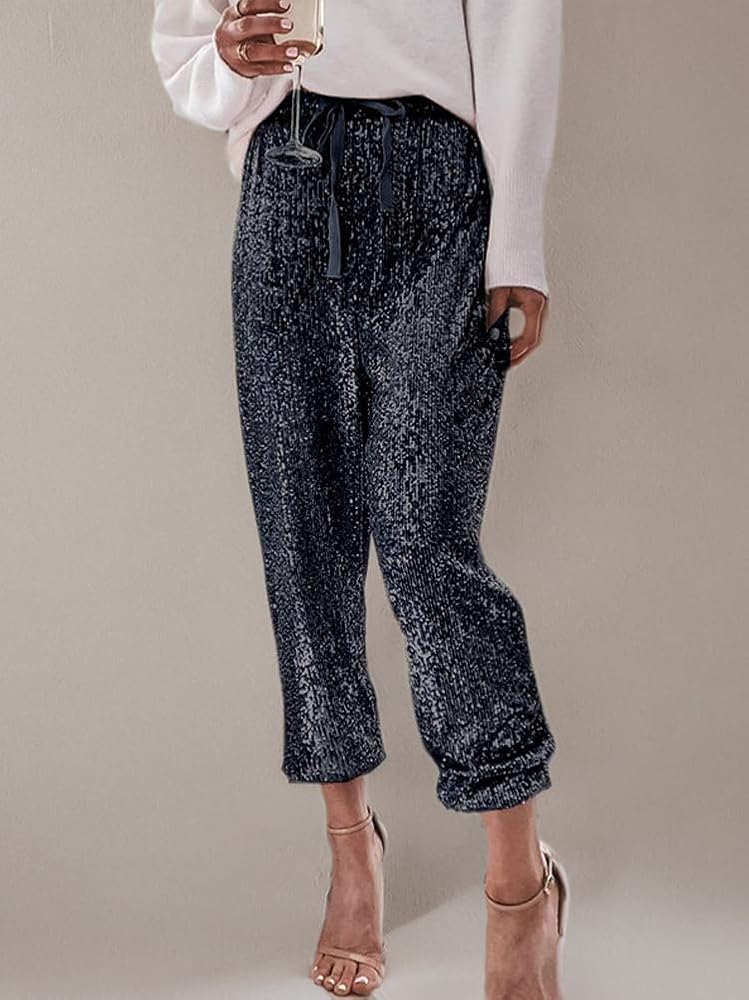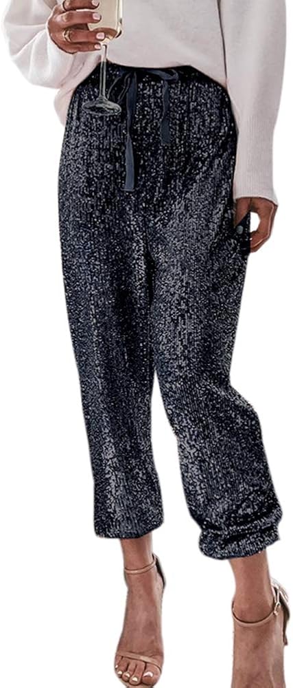 - Features: Shiny, Sequins, High Waisted, Cotton Elastic waistband, Drawstring Pencil Pants