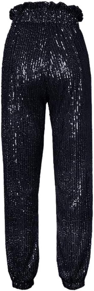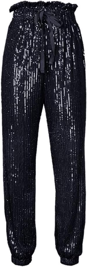 ALLUMK Womens Black Sequin Bling Legging Joggers Pencil Pants with Drawstring