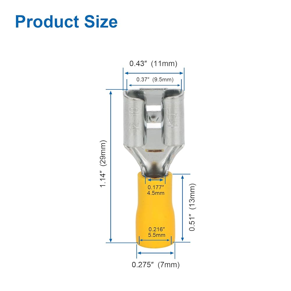 Compatibility:Fits 12-10 AWG wires (4-6mm²) and works with male spade terminals of matching size (0.375" / 9.5mm width).