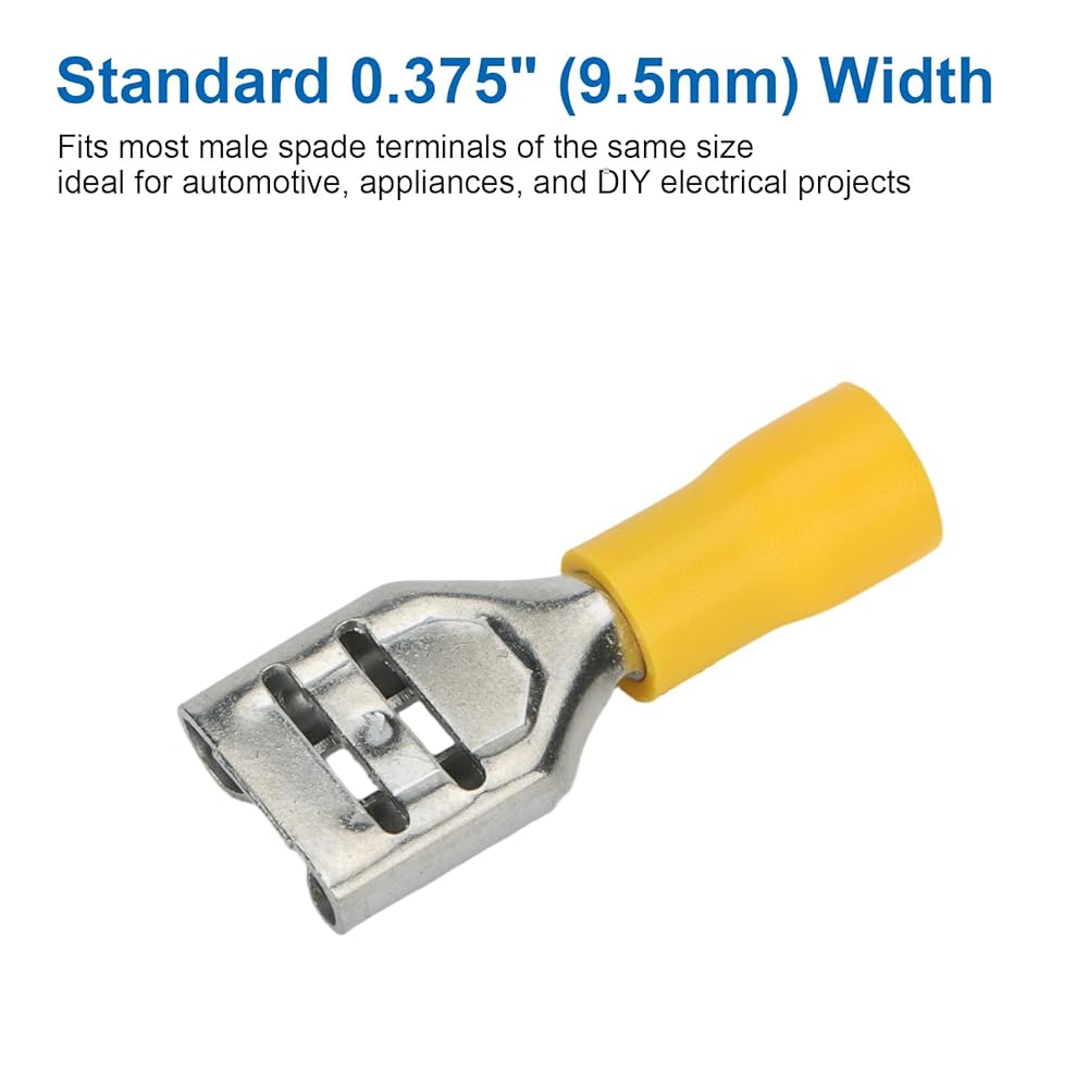 Enhance your wiring projects with Baomain Yellow Female Spade Connectors, designed for quick and secure electrical connections. These 0.375" quick-disconnect terminals fit 12-10 AWG wires, making them suitable for automotive, appliances, and industrial use.
