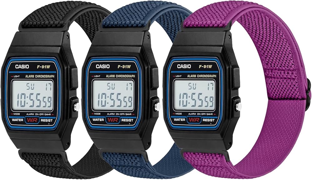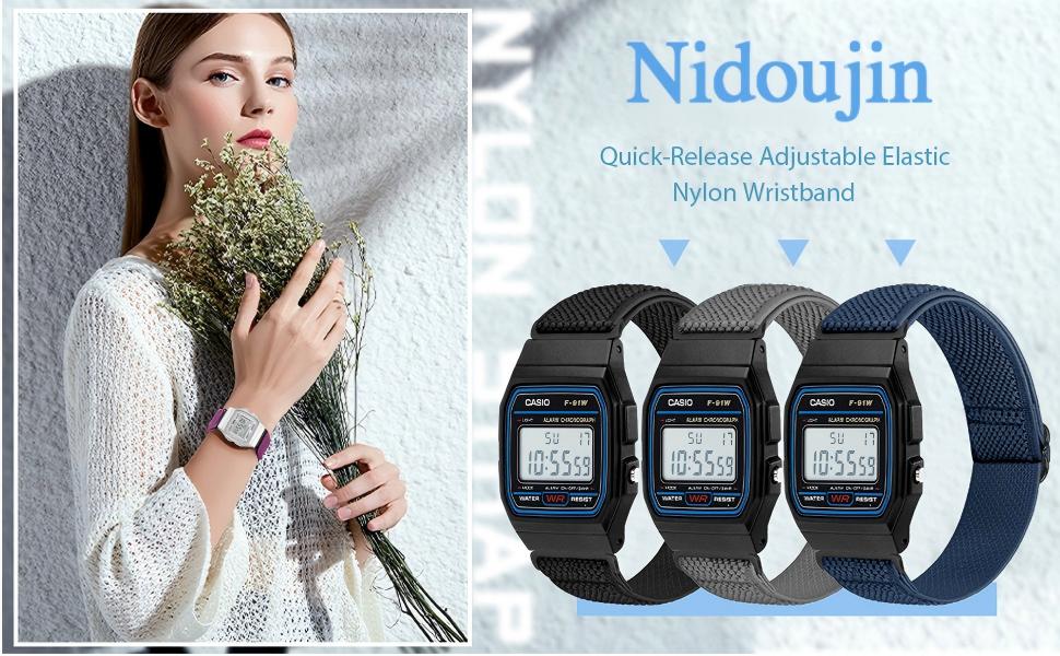【Strong Stretchy Design】The Casio F91W elastic band is woven from nylon material with strong stretchy, suitable for wrist size 5.9''-9.8'' (150mm-250mm), so it is not easy to deform and can be worn for a long time, whether it is day or night.