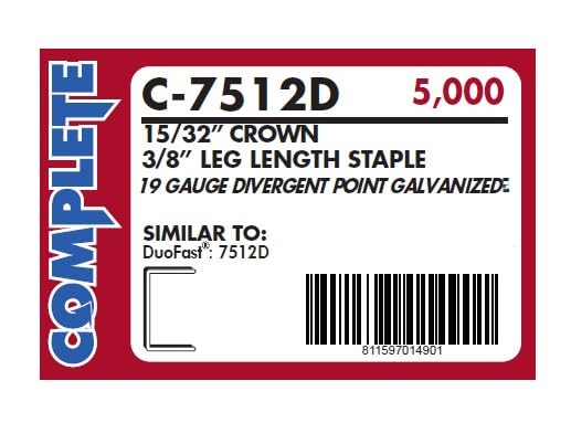 Complete C-7512D, 19 GA 3/8" Leg Length x 15/32" Crown Fine Wire Staples, 5000 per Package, Similar to Duo-Fast 75 Series Staples, Divergent Point Galvanized, for Installing Carpet Padding