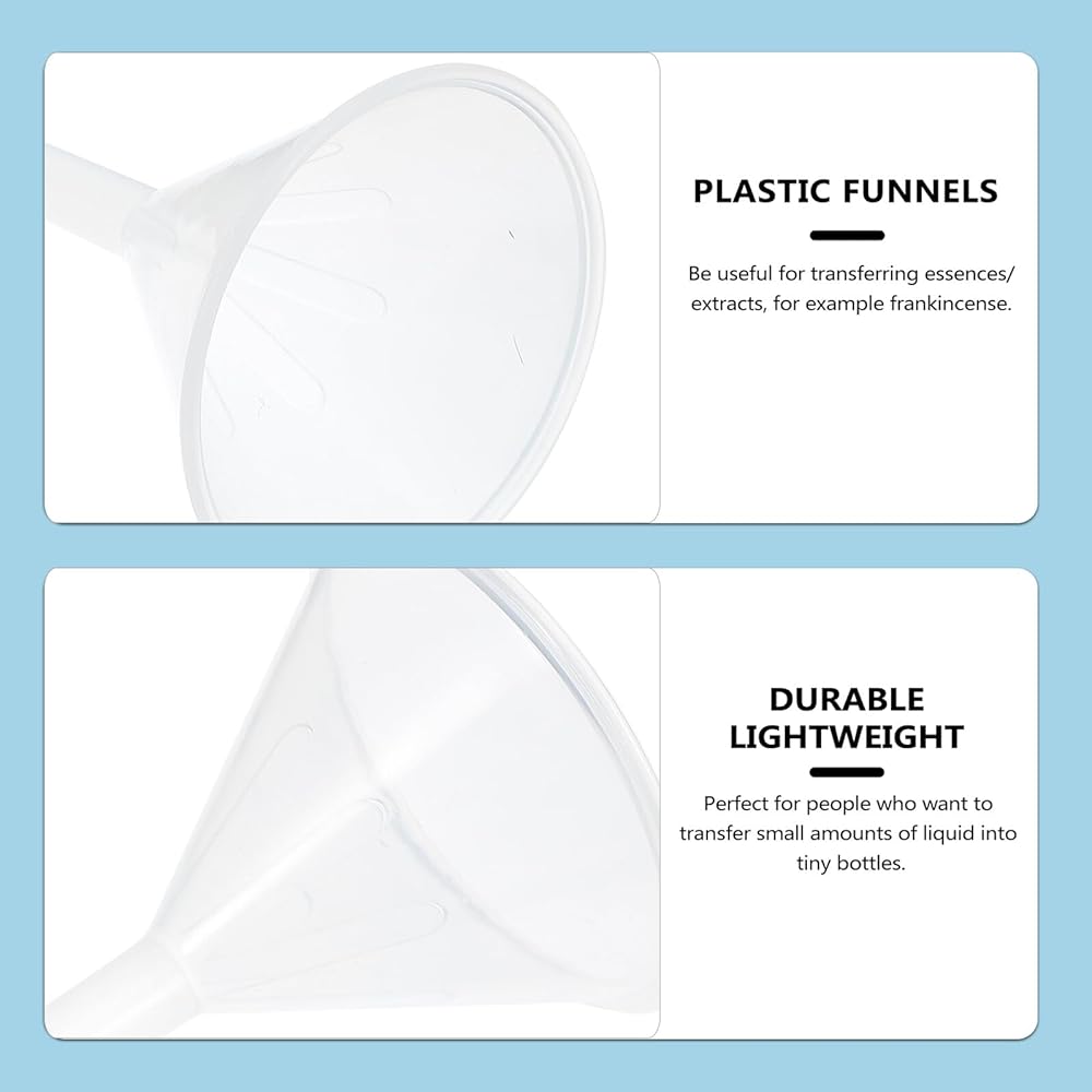- Easily transfer your essential oils into smaller dispensers without spilling, reliable and useful plastic funnel clear.