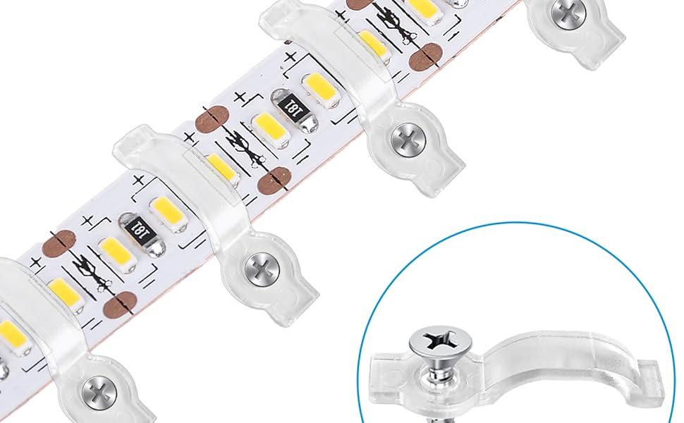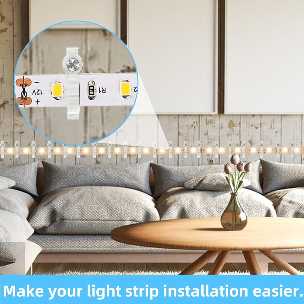 【Exceptional Stability】 The sturdy and durable strip lights clips mounting feature a clamping design that firmly holds the light strip in place, preventing sagging or detachment even under thermal expansion and contraction. Light clips provide long-lasting, reliable fixation on a variety of surfaces, including wood, metal, and concrete walls