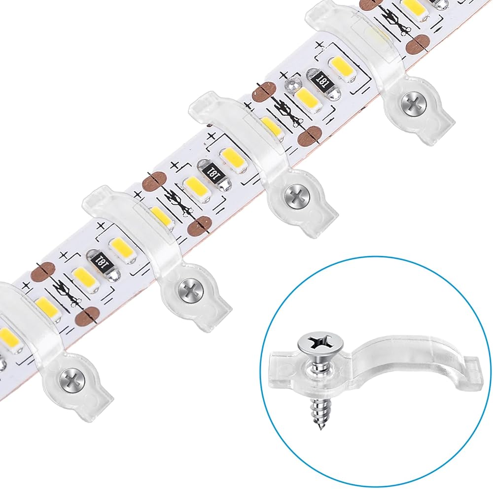 【What You'll Get】 This kit includes 100 pcs high-quality strip light clips and 100 pcs screws. This value-packed transparent fixing clips meets all your needs for large-scale or DIY light strip installations on cabinets, bookshelves, wardrobes, or outdoor eaves