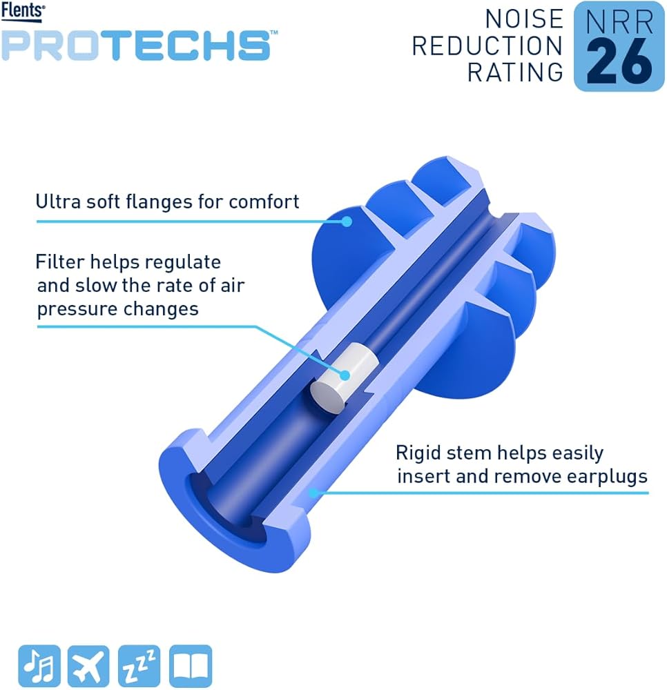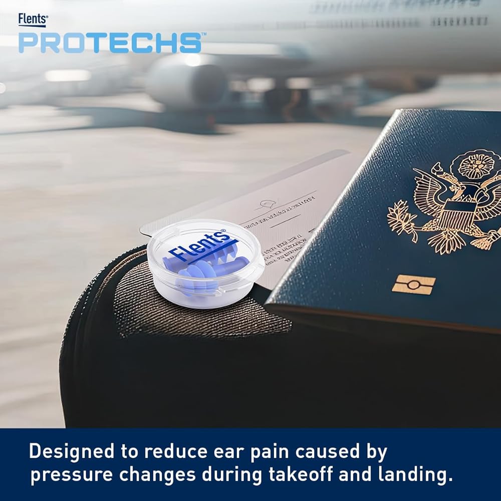 Flents Protechs PressureEase Earplugs Designed for Flying are specially engineered to help reduce ear pain and discomfort caused by rapid air pressure changes during airplane takeoff and landing. Designed with an advanced pressure-regulating filter, these airplane ear plugs help slow the rate of air pressure change in the ear canal, allowing your ears to adjust more comfortably at high altitudes and during descent. With a 26dB Noise Reduction Rating (NRR), they also help soften engine noise and cabin sounds while still allowing you to hear important announcements, making them ideal for air travel, commuting, and general noise reduction. The ultra-soft, multi-flange ear tips provide a secure and comfortable fit for extended wear, while the rigid stem makes insertion and removal quick and easy. Durable and easy to clean, these durable flight earplugs are designed for trips, making them a reliable travel essential for frequent flyers, vacationers, and anyone sensitive to pressure changes. Each pack includes one pair of blue pressure reducing earplugs and a compact protective storage case, perfect for keeping them safe in your carry-on, backpack, or purse so you're always prepared for a more comfortable flying experience.