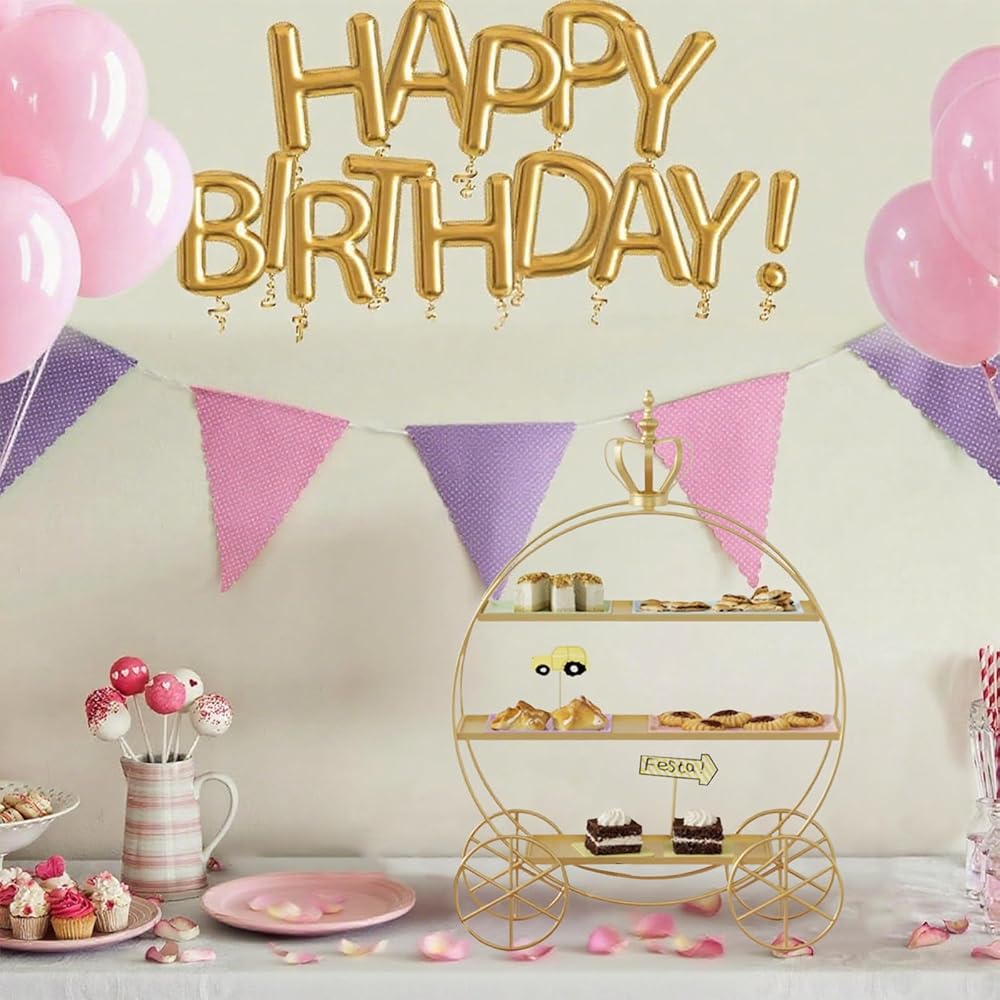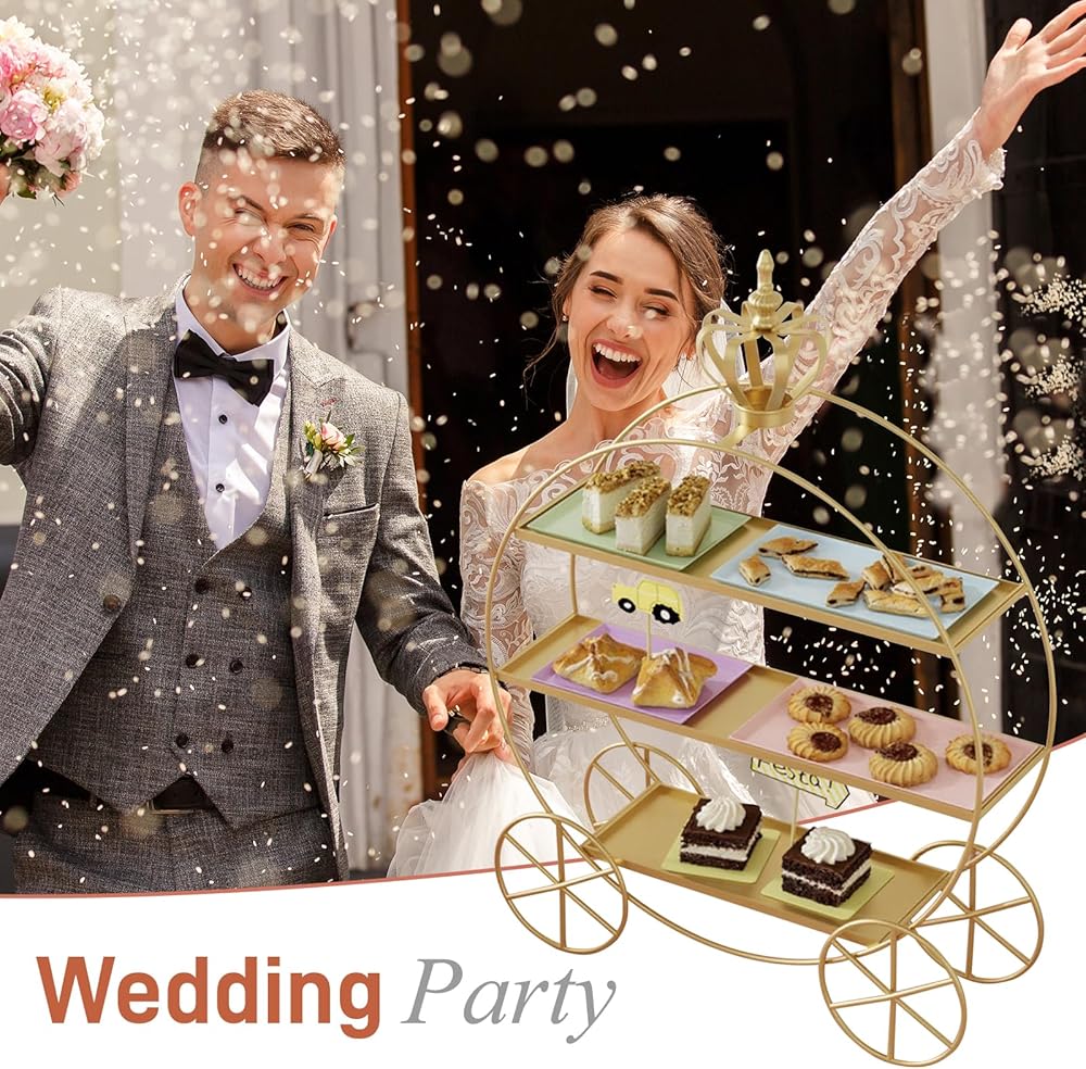 Perfect Size: This 3-layer cake stand offers ample space for pastries, cupcakes, fruits, and snacks, keeping your treats organized in style; The overall size of this carriage cake stand is 35x10x50cm/13.78x3.94x19.69inch. The top tray measures 30x10cm/11.8x3.94inch, the middle tray 35x10cm/13.78x3.94inch, and the bottom tray 20x10cm/7.88x3.94inch