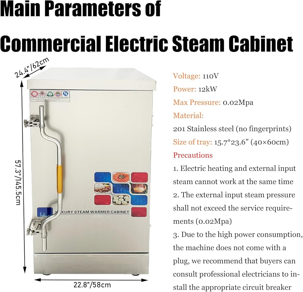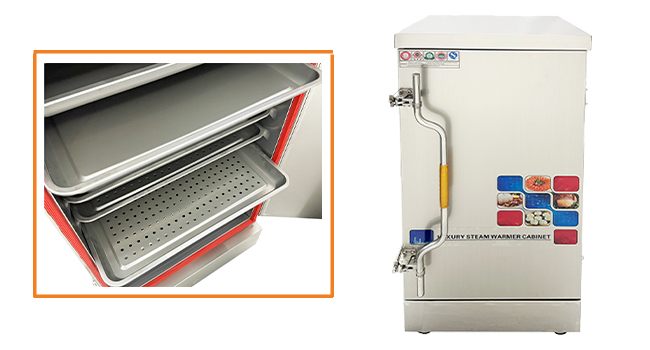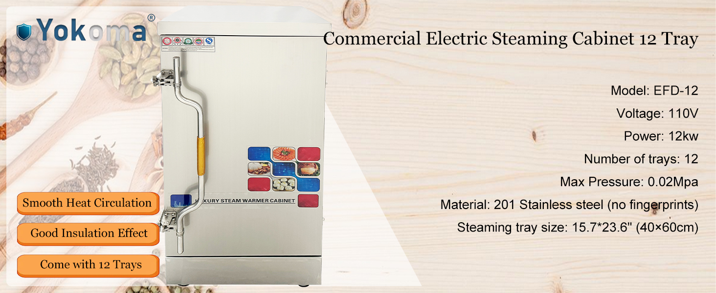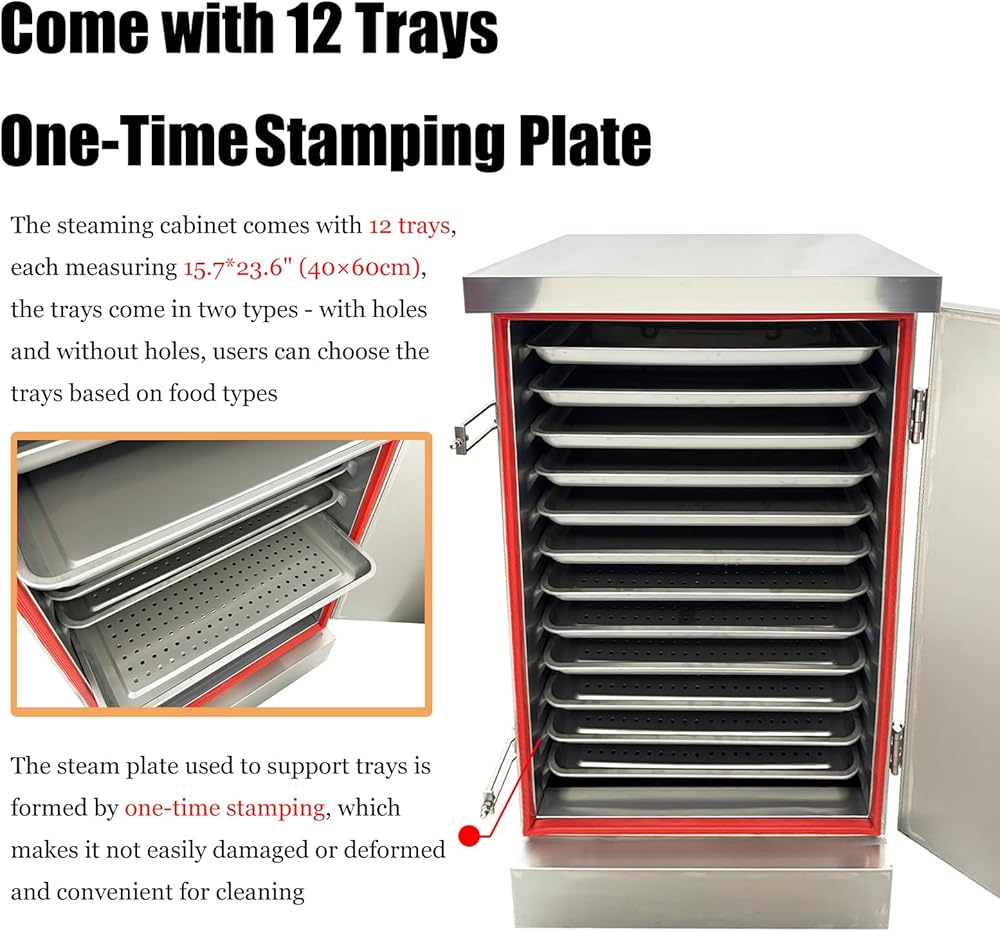 Come with 12 Trays: The steaming cabinet comes with 12 trays, each measuring 15.7*23.6" (40×60cm), the trays come in two types - with holes and without holes, users can choose the trays based on food types, additionally, the steam plate used to support trays is formed by one-time stamping, which makes it not easily damaged or deformed and convenient for cleaning