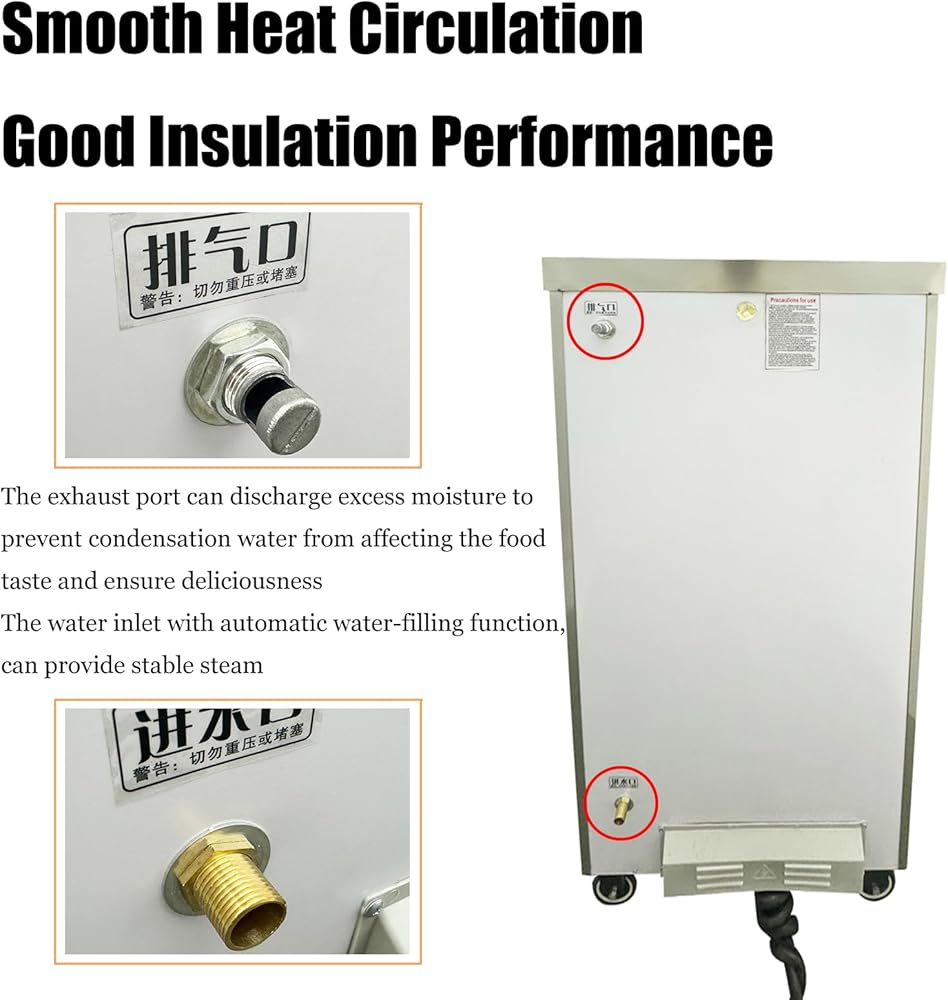 Good Insulation Performance: At the rear of the electric steaming cabinet, there is an exhaust port that mainly used to control the humidity during cooking process, promptly discharge excess moisture, prevent condensation water from affecting the food taste and ensure deliciousness, the interior of steamer uses heat-resistant polyurethane foaming process, which not only provides insulation but also maintains heat retention, so users can use it with confidence