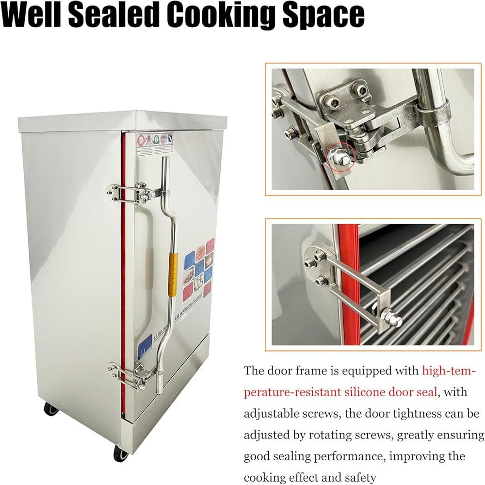 Well Sealed Cooking Space: The door frame of the steamer is equipped with high-temperature-resistant silicone door seal, combined with the adjustable screws, the tightness of the steamer door can be adjusted by rotating screws, which greatly ensures good sealing performance, thereby improving the cooking effect and safety