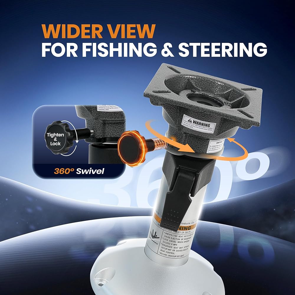 - HEAVY DUTY BOAT SEAT MOUNT BASE:9-inch sturdy aluminum base with strong load-bearing, stable support and reduced wobble.