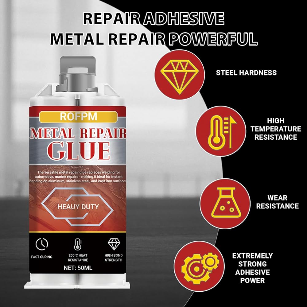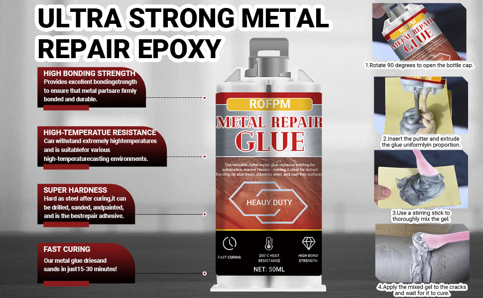 Heavy-Duty Metal Strong Bonding: ROFPM Metal Epoxy Glue delivers industrial-grade adhesion - the ultimate solution for metal to plastic, wood and aluminum repairs. This metal adhesive creates permanent bonds resistant to impacts, chemicals, and extreme temperatures. Great for fixing cracked bumpers, motorcycle fairings, or metal fences. The strong foundry glue transforms into drillable and sandable metal after 24 hours curing.
