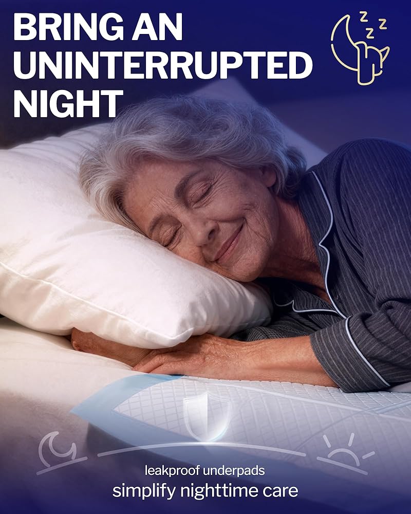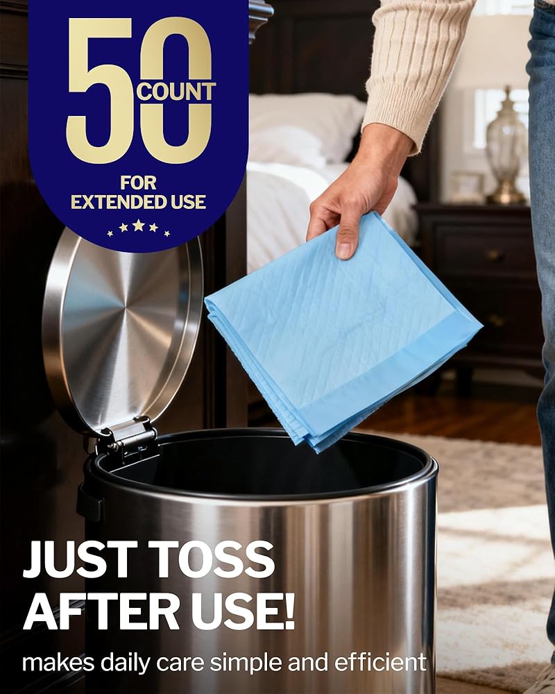 GENEROUS SIZE PROTECTION: Designed in a large 36" x 30" format and offered in a convenient 50-count set, this disposable bed pad for adults covers a wide area across beds, sofas, or chairs. The generous surface allows natural turning and movement while providing consistent bedding protection, reducing the need for frequent restocking.