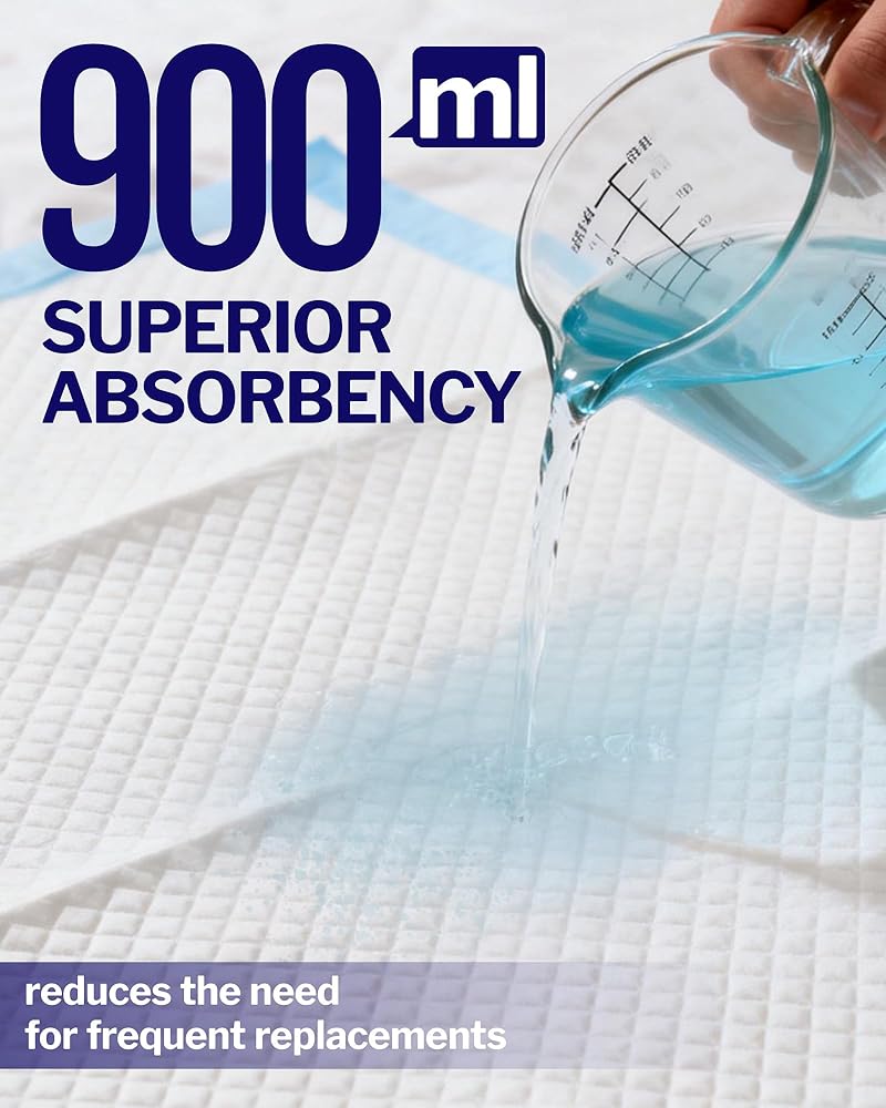 SUPER ABSORBENT: This disposable underpad features a 6-layer absorbent structure that holds up to 900ml and quickly turns liquid into gel. Quilted patterns on the surface help distribute moisture evenly, preventing buildup. It allows extended use while reducing interruptions during routine or nighttime care.