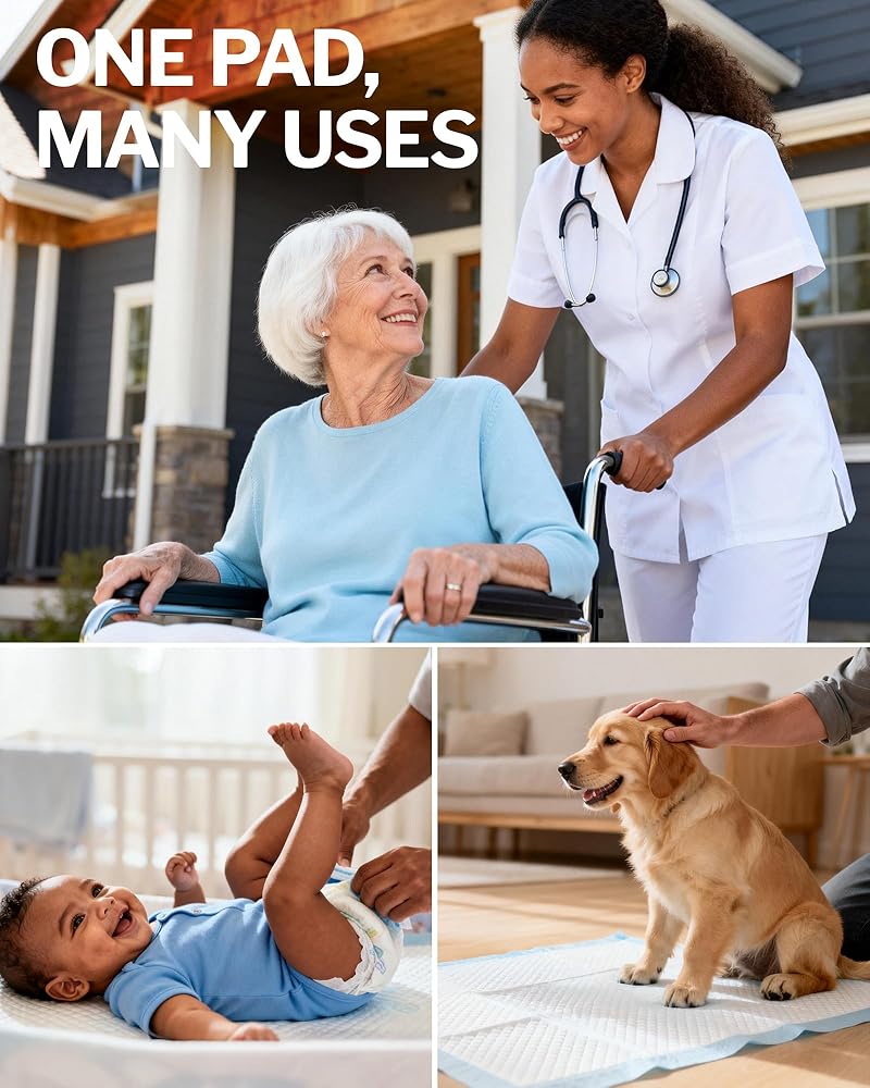 MULTI-PURPOSE PAD: Designed with a versatile disposable construction, this pad for bed for incontinence adults adapts easily to multiple care situations. It supports daily care for the elderly and post-surgery recovery, while also serving as a practical surface for baby diaper changes and as a pee pad for dogs.