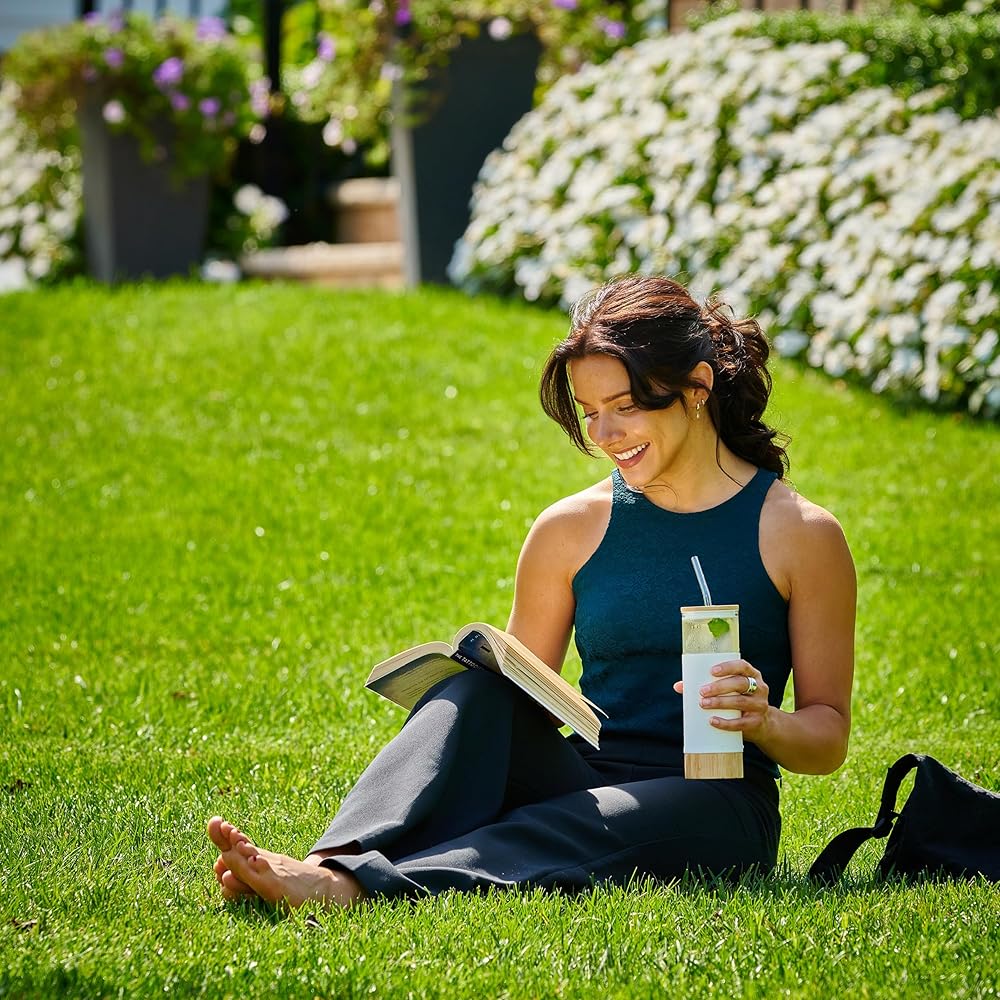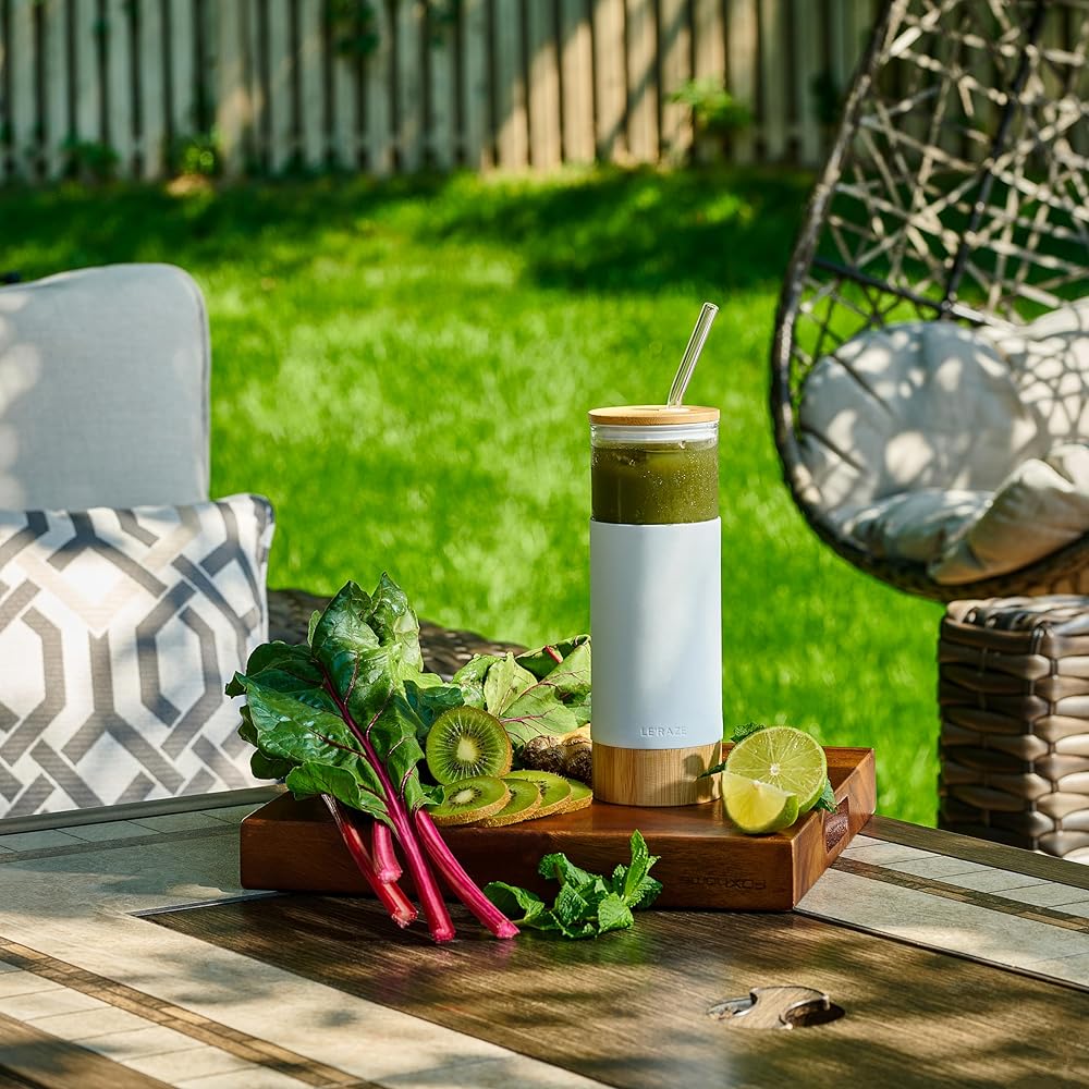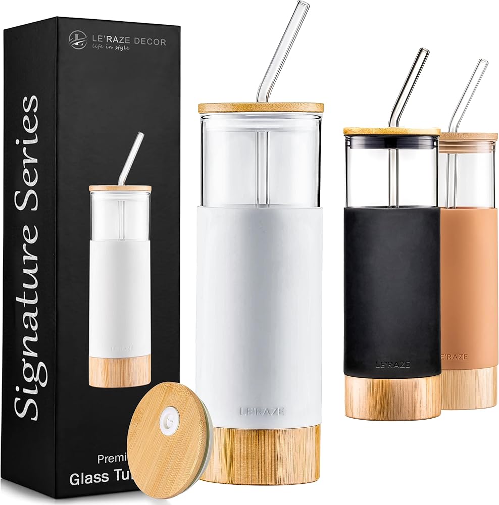 Premium 20oz Glass Tumbler Cup with Straw and Bamboo Lid & Base with Protective Silicone Sleeve - BPA Free - Growler Water Bottle Reusable Drinking Glasses Cup for Iced Tea, Coffee, Smoothie - White