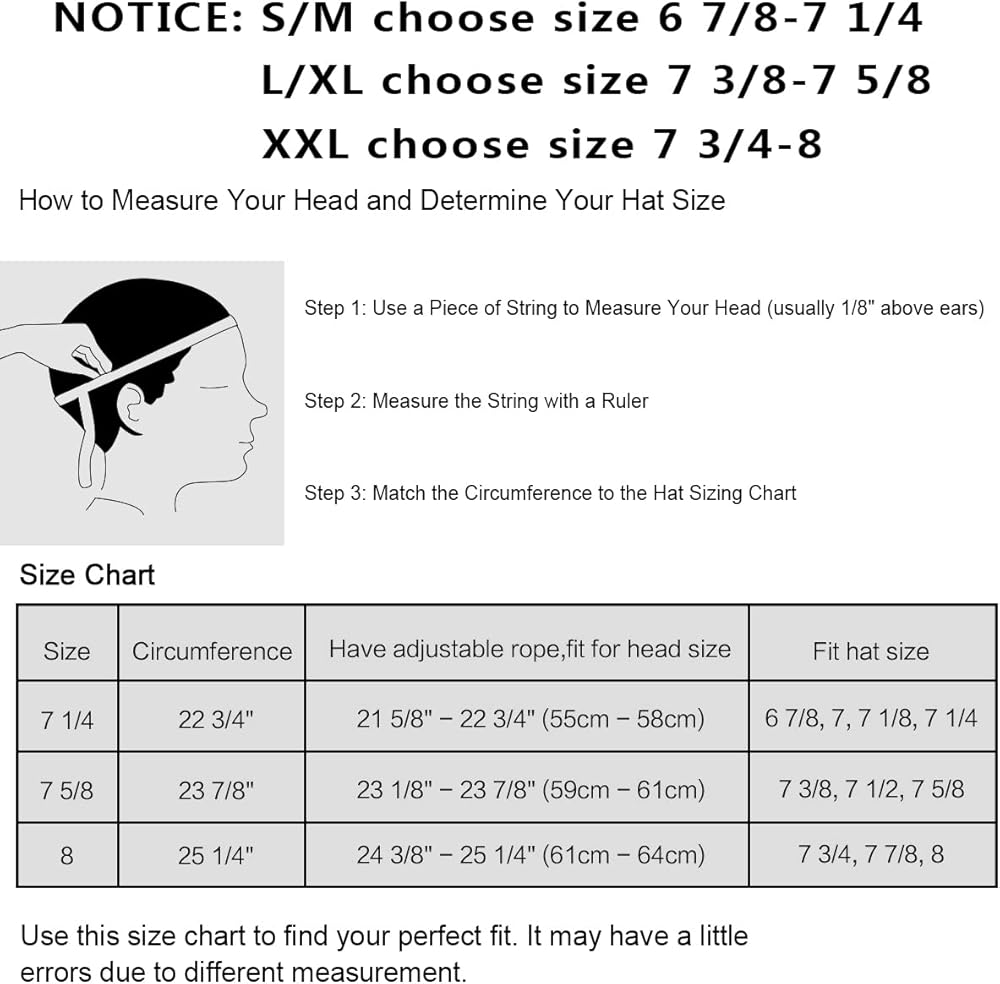 Size and Tips - The hat has 3 sizes: 7 1/4 and 7 5/8, have adjustable rope, adjust the size when you need. Size 7 1/4 fits head circumference 21 5/8"-22 3/4", US Hat Size 6 7/8, 7, 7 1/8, 7 1/4. Size 7 5/8 fits head circumference 23 1/8"-23 7/8", US Hat Size 7 3/8, 7 1/2, 7 5/8. Size 8 fits head circumference 24 3/8"-25 1/4", US Hat Size 7 3/4, 7 7/8, 8. Washing Tips: Dry clean or hand wash cold, lay flat to dry. Please feel free to contact us.
