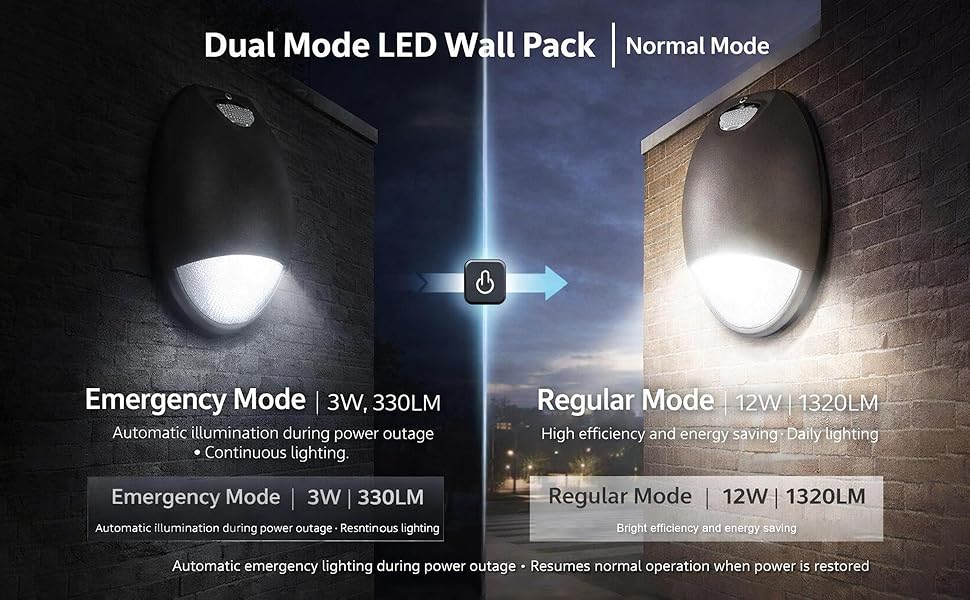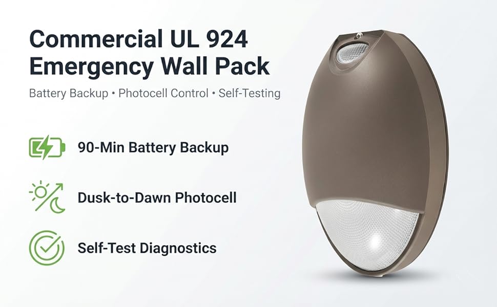 UL 924 Emergency Wall Pack: UL 924 certified emergency wall pack with durable die-cast aluminum housing, designed to provide code-compliant emergency illumination for commercial buildings during power outages.