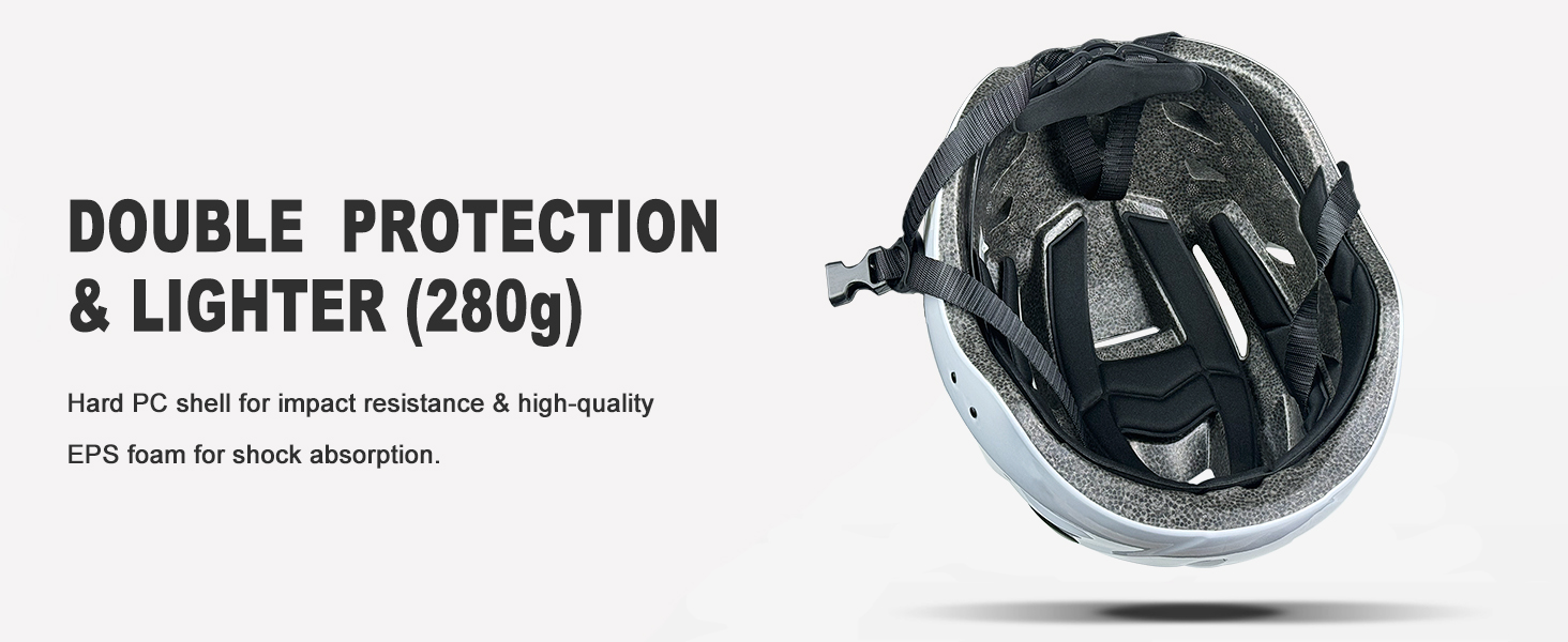 Complies with U.S. CPSC Safety Standard for Bicycle Helmets: Integrated lightweight structure (280g) combines EPS foam and high-density PC shell to ensure better shock absorption and protection.