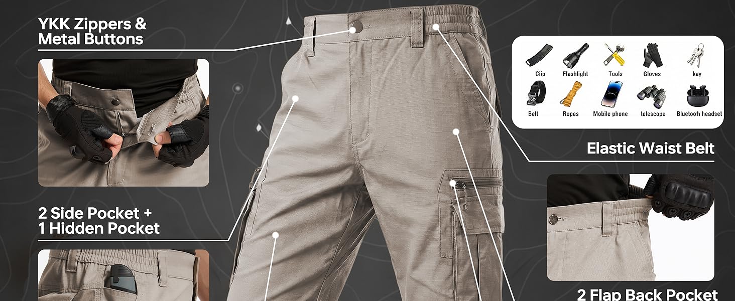 【Upgrade Details】These men's tactical cargo pants are designed with an elastic waistband and available in multiple sizes to deliver a comfortable, snug fit for various waist sizes. The thigh zipper pockets are equipped with antique brass zippers for smooth functionality and a unique, stylish look.