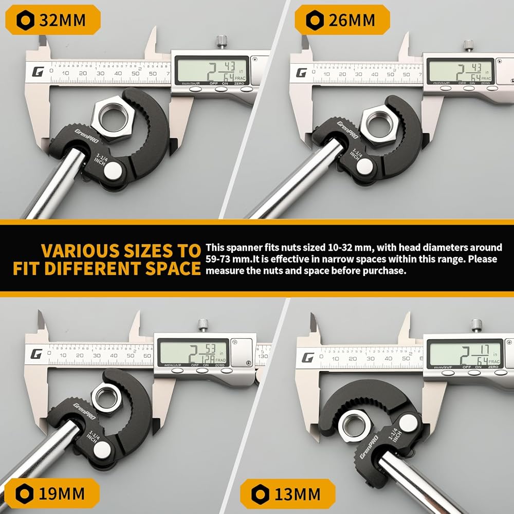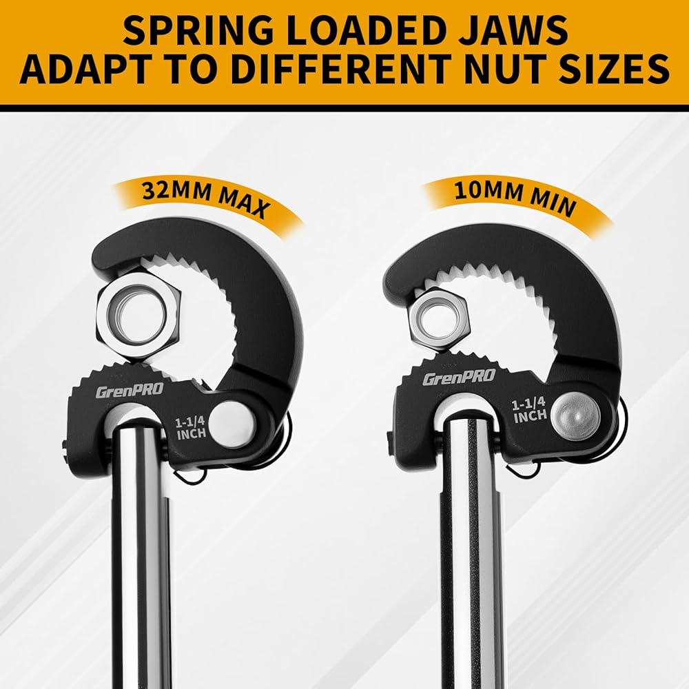 ADJUSTABLE JAWS: This 11 " basin wrench is a must-have plumbing tool for tight spaces, spring-loaded jaws, that can accommodate different sizes of pipe nuts. Under sink wrench faucet tool fits any lug nuts and fittings measuring 3/8-inch (10 MM) to 1-1/4-inch (32 MM) in diameter