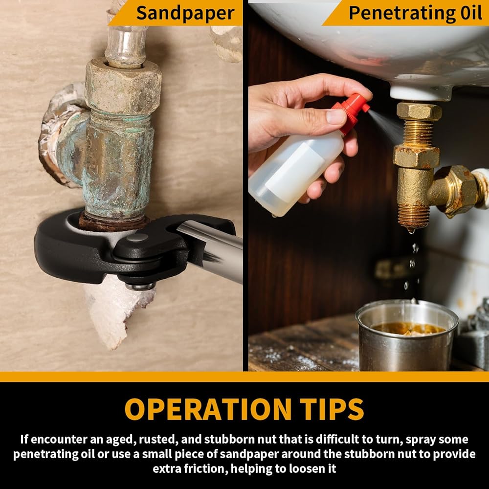 OPERATION TIPS: If you encounter an old, rusty and difficult to rotate nut, you can spray some permeable lubricant first, and then polish it with a small piece of sandpaper around the hard to rotate nut to increase friction to help loosen it