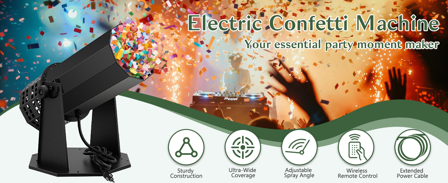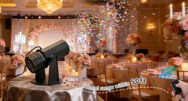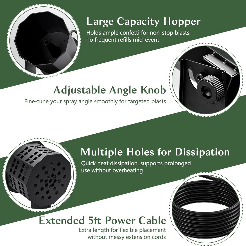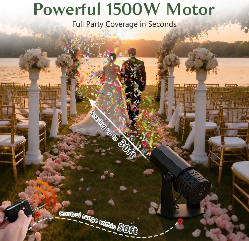 Powerful 1500W Blower for Wide-Area Coverage: A strong, directed air stream sends confetti soaring high and spreading wide, creating a vibrant, lively visual effect that fills any venue with color and graceful movement