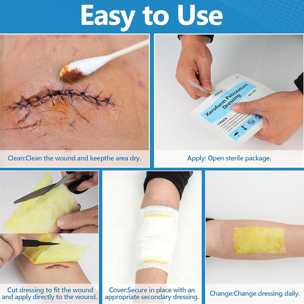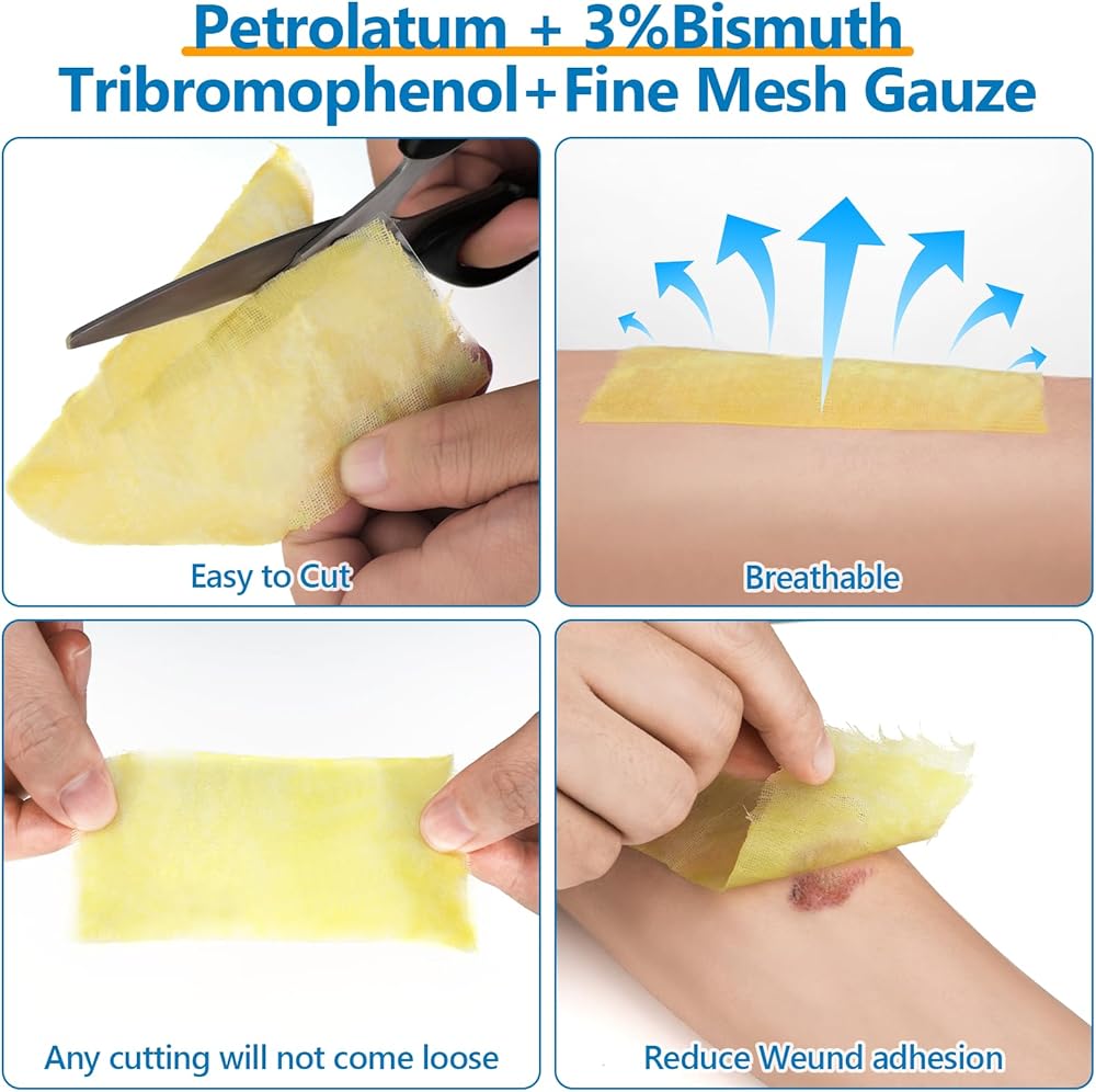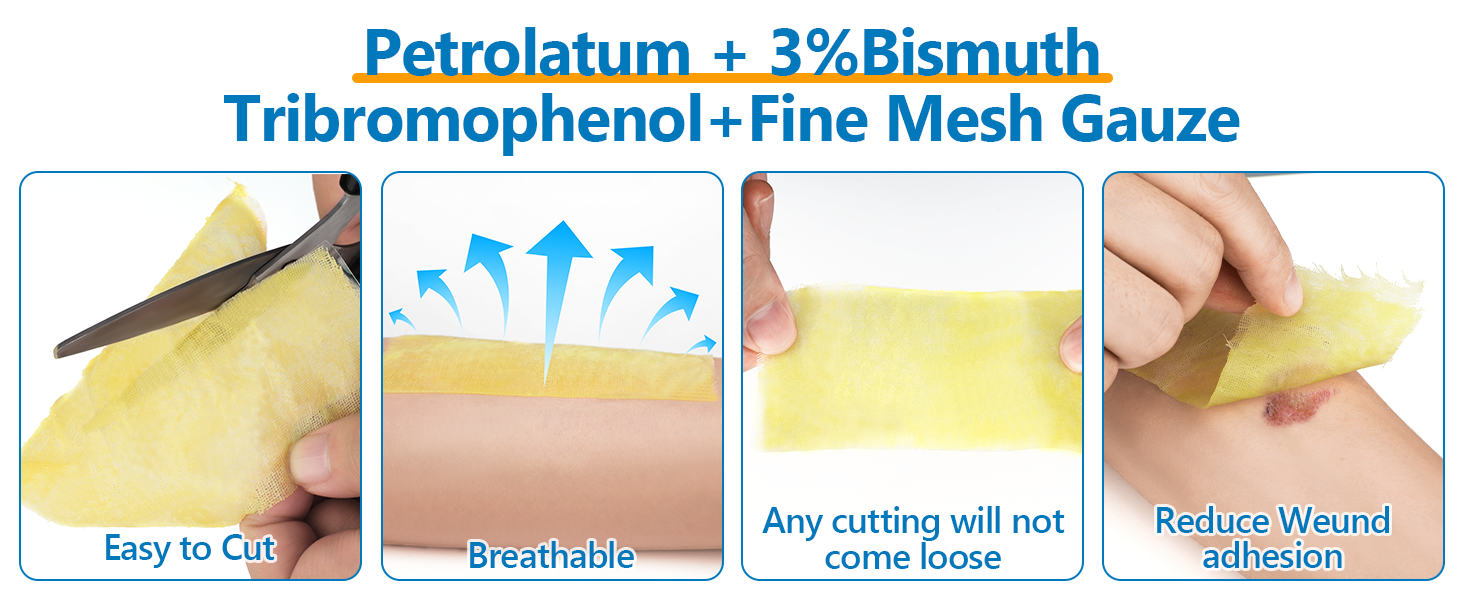 【 Non-Adherent & Easy to cut】Xeroform petrolatum dressing adopts a non-adhesive design, which fits the skin wound and can be cut according to the size and shape of the wound. Non-adhesive wound dressings eliminate the need for frequent adjustments and reduce pain and trauma when changing dressings