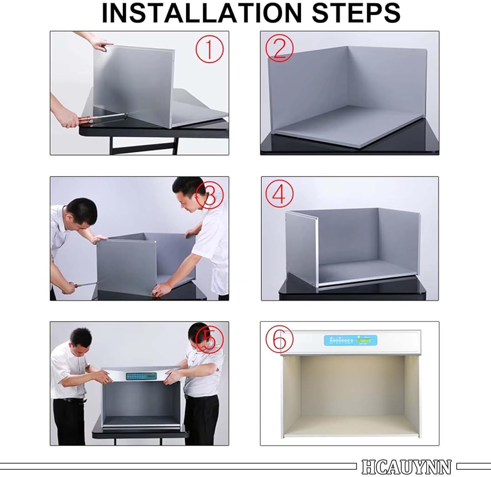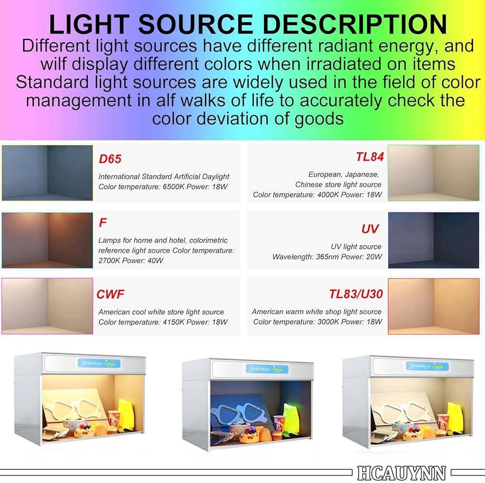Ensure consistent color accuracy and enhance your quality control process with our professional color calibration booth. Ideal for industries such as textiles, printing, cosmetics, and manufacturing, this light booth creates a controlled environment for evaluating colors under various lighting conditions. Effortlessly simulate ambient lighting, including natural daylight (D65) and retail lighting (TL84), to test product samples and identify metamerism. With the ability to switch between six preset light sources, you can easily assess color performance in different scenarios. The user-friendly touch interface simplifies operation, while the autosave feature secures essential data during unexpected power interruptions. Boasting a color rendering index of ≥97%, this light booth is essential for designers, quality inspectors, and production managers who prioritize accuracy and reliability. Whether you are verifying fabric dyes or ensuring precise matching of plastic components, our solution helps maintain brand integrity and minimize waste. Specifications: - Light Box Model: 6 Light Sources - Color Rendering Index: ≥97% - External Dimensions: 650*525*500mm - Internal Dimensions: 620*500*355mm - Weight: 21.5 kg Packing List: Color Matching Light Box*1 Please note: Slight color variations may occur due to lighting during photography, and there may be a 1-3cm measurement error due to manual measurement.