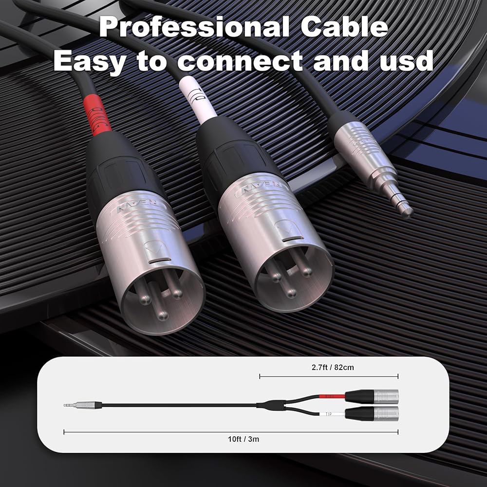 Proreck 10FT Y-Splitter Stereo Breakout Cable – 3.5mm Stereo AUX to Dual Mono XLR Male, Neutrik Rean Connectors, 25 AWG, Ideal for Stage, Studio, and Live Sound Applications