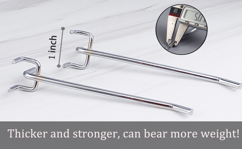 Great for 1/4"peg boards: Made from heavy-duty hardened steel, these pegboard hooks, These 6inch hanging hooks fit all types of 1/4" peg boards with 1” .