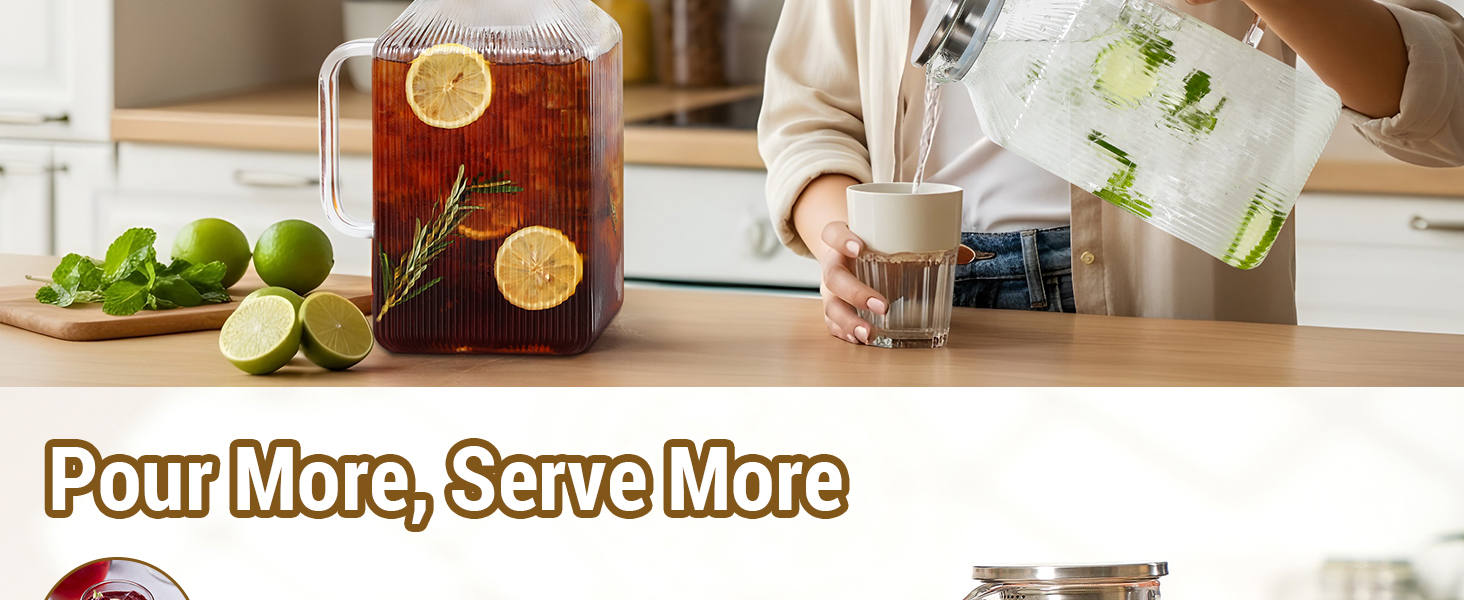 Durable Borosilicate Glass: Made from high-quality borosilicate glass, this pitcher performs excellently in extreme temperatures (-4°F to 302°F), without cracking or leaching chemicals – unlike ordinary glass. Its superior clarity enhances the visual appeal of your beverages, and borosilicate glass is lighter yet stronger than regular glass. No plastic taste, no stubborn stains. Additionally, it is dishwasher-safe for quick and easy cleaning