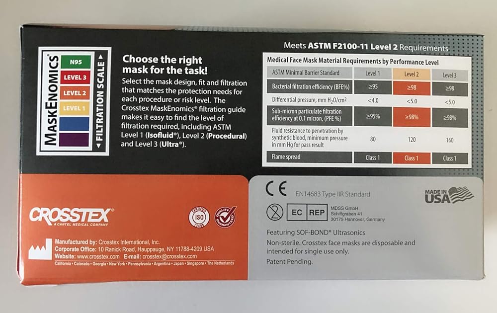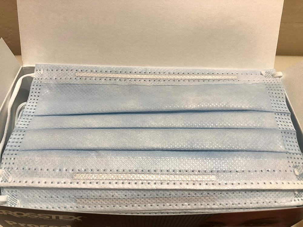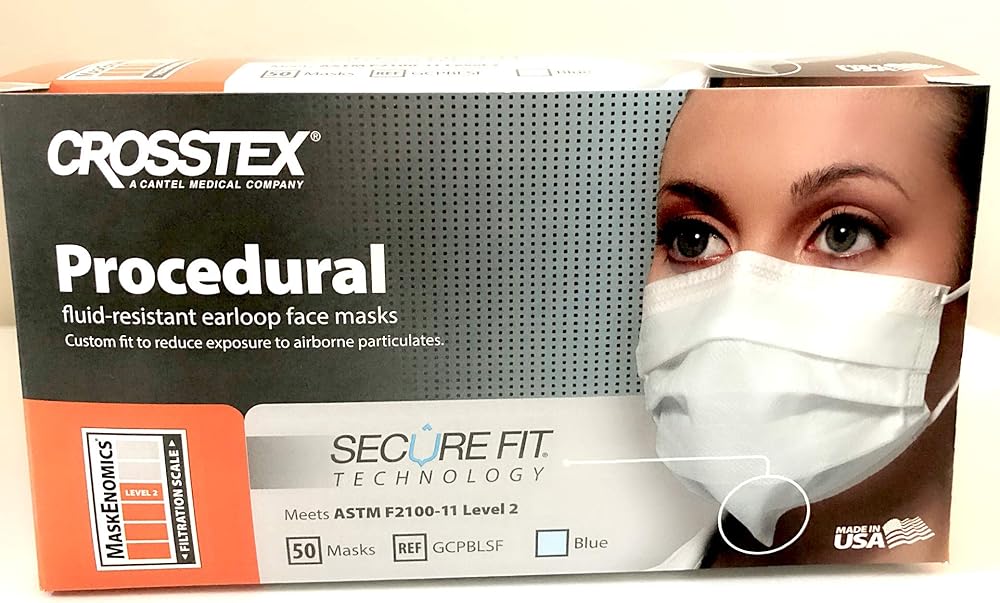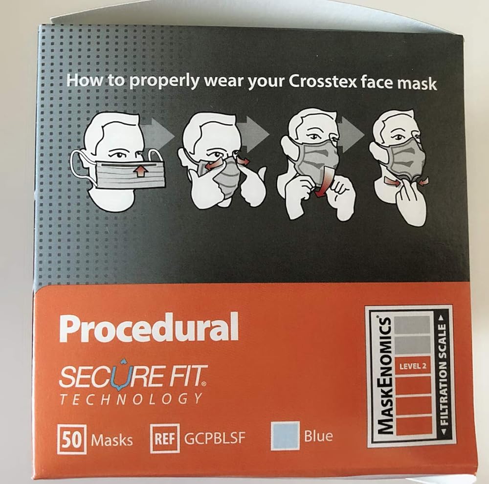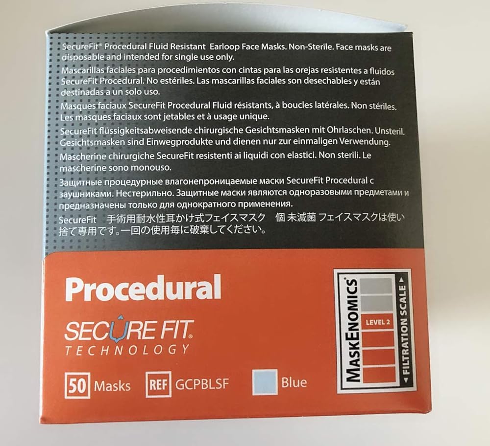 Earloop Masks - BLUE 40/Bx. Fog-Free w/SecureFit Technology. Fluid Resistant Outer Layer with White Tissue Inner Layer, with FogFree strip on inner layer. Extra-Long Aluminum Nose Piece, Aluminum Strip Under the Chin to create a custom fit with a tight seal at the bottom and sides of the mask. Latex-Free. Box of 40 masks.