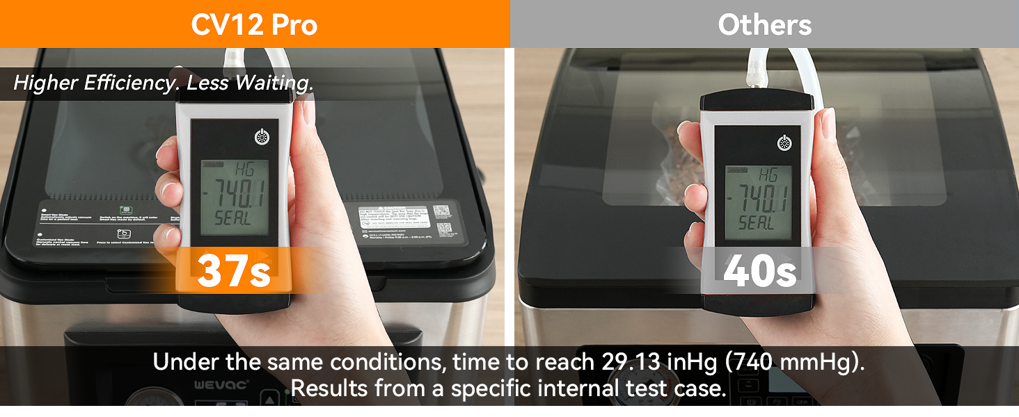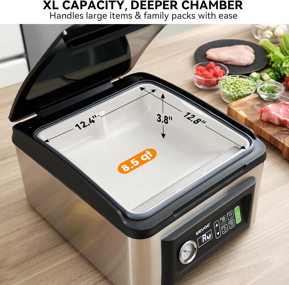 Spacious, Extra-Deep 8.5 qt Chamber: With a generous 12.4" W × 12.8" L × 3.8" H chamber, the CV12 Pro easily fits bulky roasts, large cuts of meat, and family-size portions. The 4-inch depth also makes it ideal for vacuum sealing soups, marinades, and other liquid-rich foods without mess or spillover