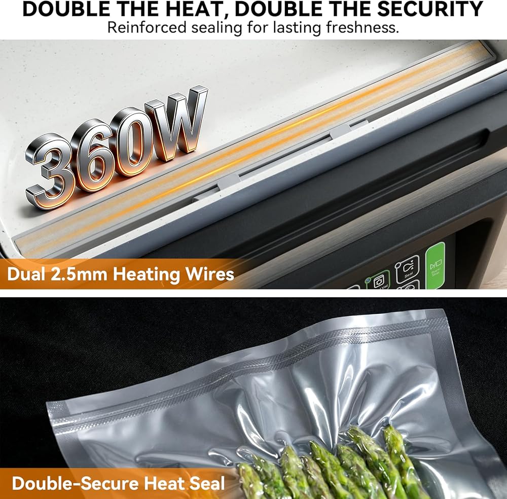 Commercial-Grade Pump & Double Sealing Wires: A powerful commercial-grade pump delivers fast, complete air removal, while the 12” seal bar with dual sealing wires creates a strong, leak-proof seal you can rely on for liquids, meats, and sous vide cooking