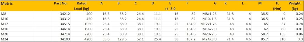 Heavy Duty Hoist Ring Threaded Stud Specifications: Size M10X1.50, Working Load Limit: 450kg Forged and machined high strength alloy steel, Black Oxide Finish for corrosion resistance Minimum Design Factor = 5:1, Magnetic Particle Inspected Per ASTM E1444, Hoist Rings retain the same rated load from 0 to 90 degrees from the bolt axis Meets Military Specification No. MIL-STD 209, Meets ANSI/ASME B30.26 Proudly Made in the USA, ADB Part Number: 34312