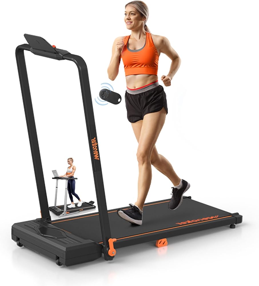 [NO Assembly &Easy to Move and Store] This portable treadmill comes pre-assembled and is ready to use right out of the box. Transport wheels make the walking pad easy to move. Even women and seniors can easily move and place it under a desk, bed, or sofa. Space-saving, folded height is 4.1 inches, suitable for home, apartment, office use.