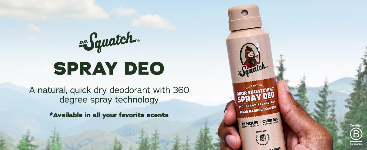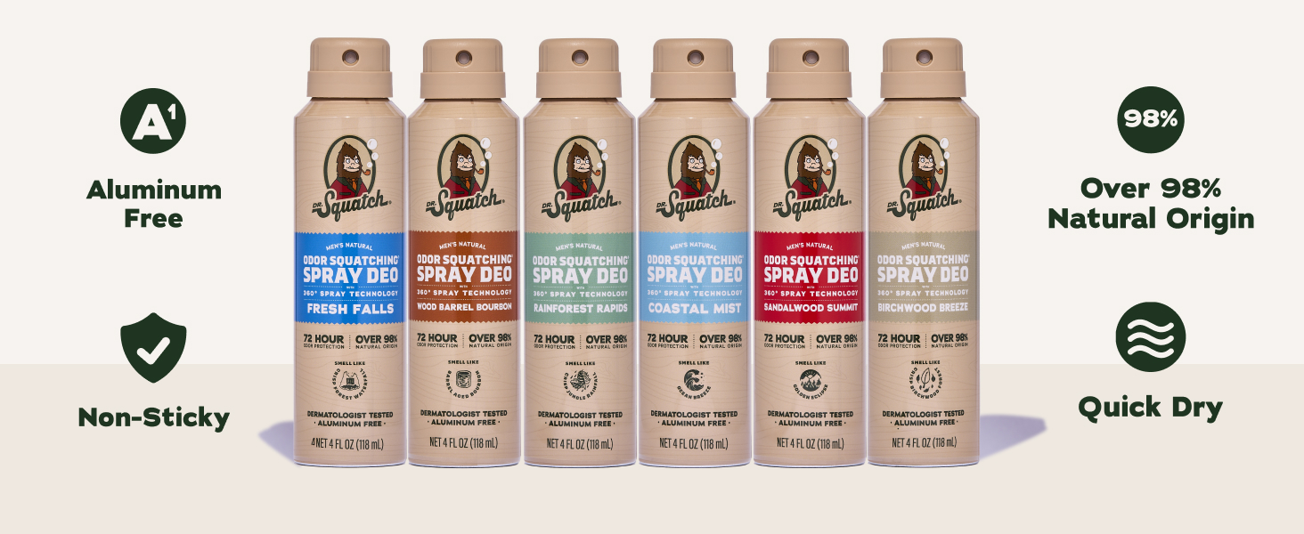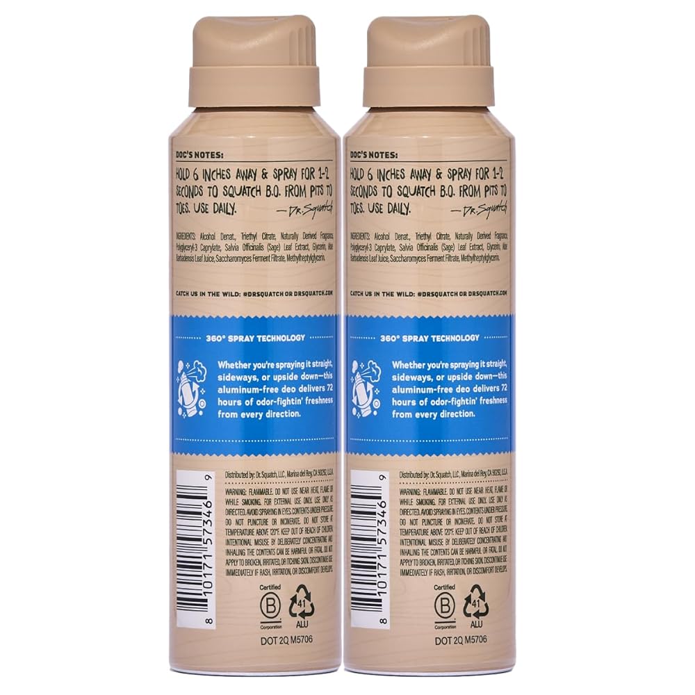 QUICK DRY FORMULA: Dr. Squatch 2-Pack Spray Deodorant dries fast and won't stain, delivering unstoppable freshness. The 360° technology provides smooth, even coverage from every angle