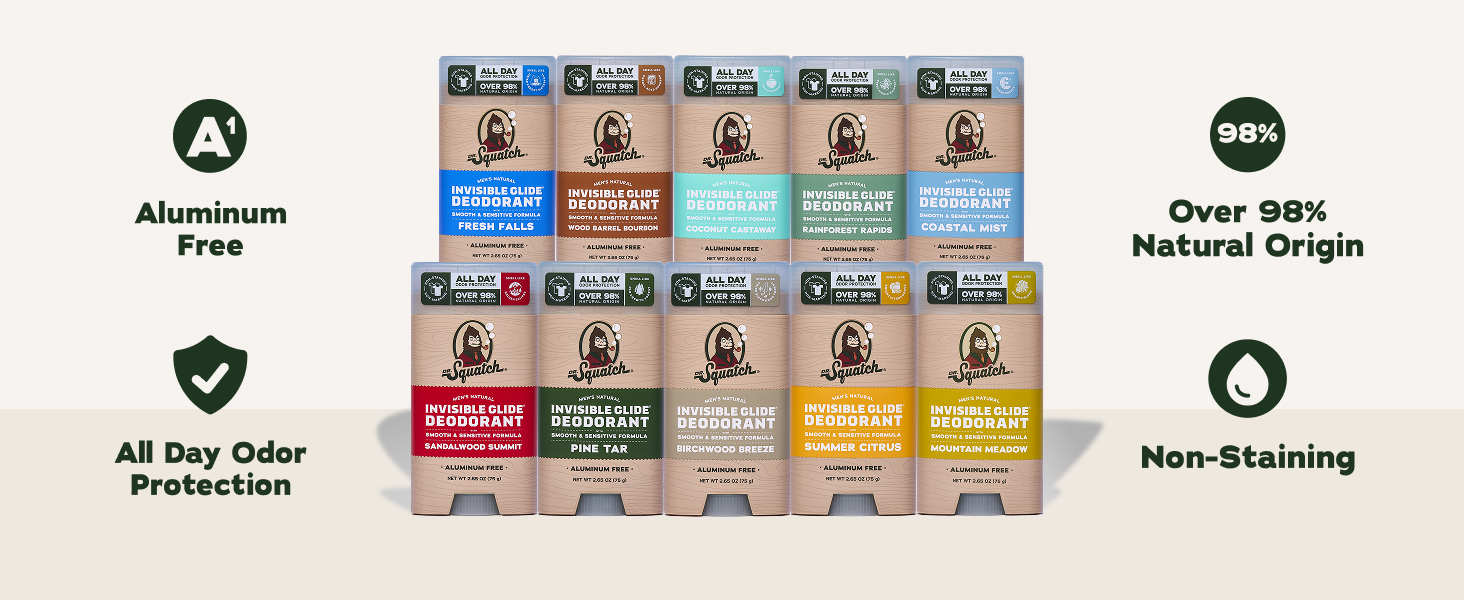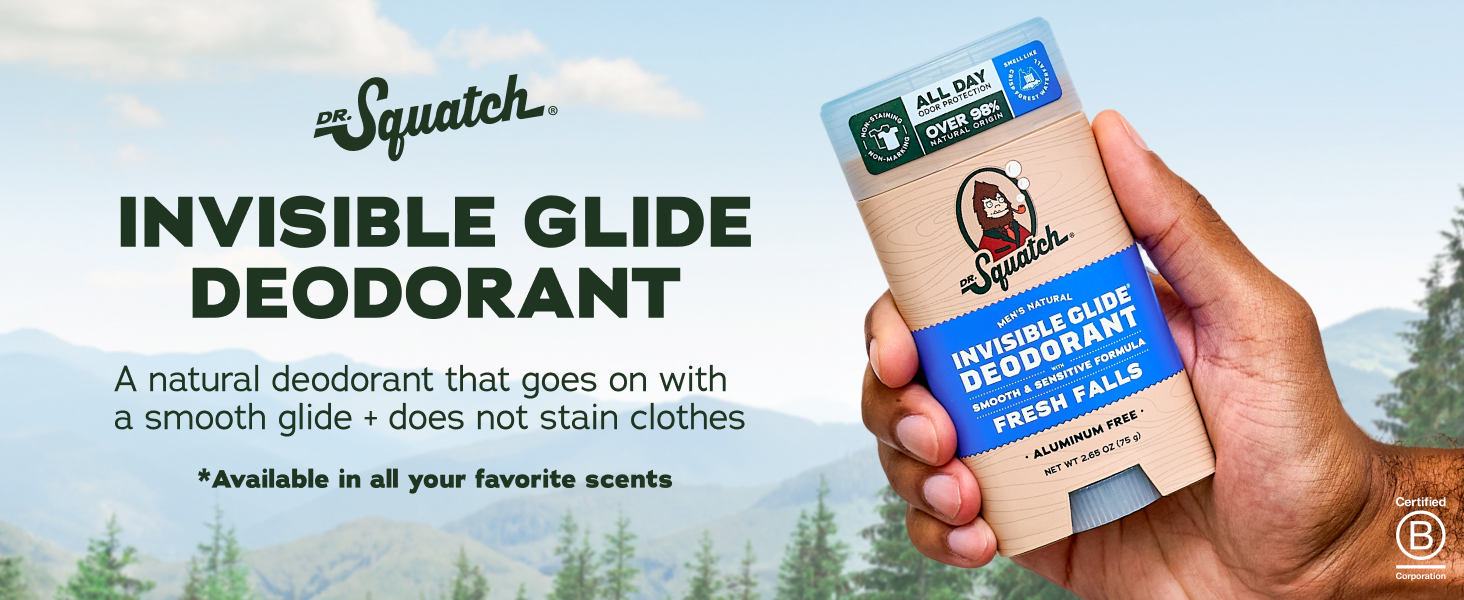 NO STAINS, NO STREAK: Dr. Squatch 2-Pack Invisible Glide Deodorant goes on smooth and stays invisible. No marks, no residue, and no stains on your favorite shirts. Just clean, all-day freshness