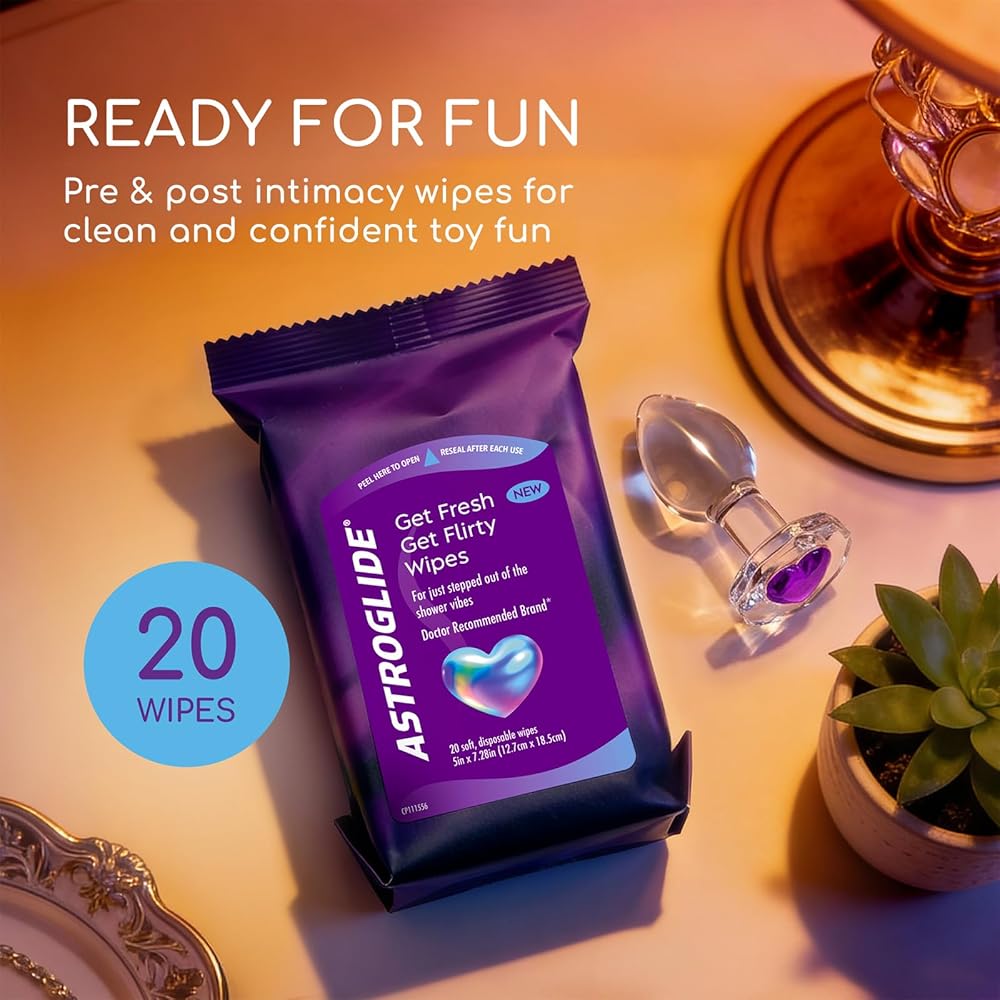 Keep adult toys fresh and ready with Astroglide Sex Toy Cleaning Wipes, a convenient sex toy cleaner made for quick, everyday use. These pre‑moistened wipes help remove common residue, including bodily fluids and water‑based or silicone‑based lubricants, so toys stay clean and well maintained between uses. The alcohol‑free, residue‑free formula wipes clean without leaving sticky buildup and is safe for both skin and toys. Designed for a wide range of adult toys and materials; including silicone, plastic, glass, metal, and rubber. Simply wipe and discard for fast, mess‑free cleaning. Do not flush.