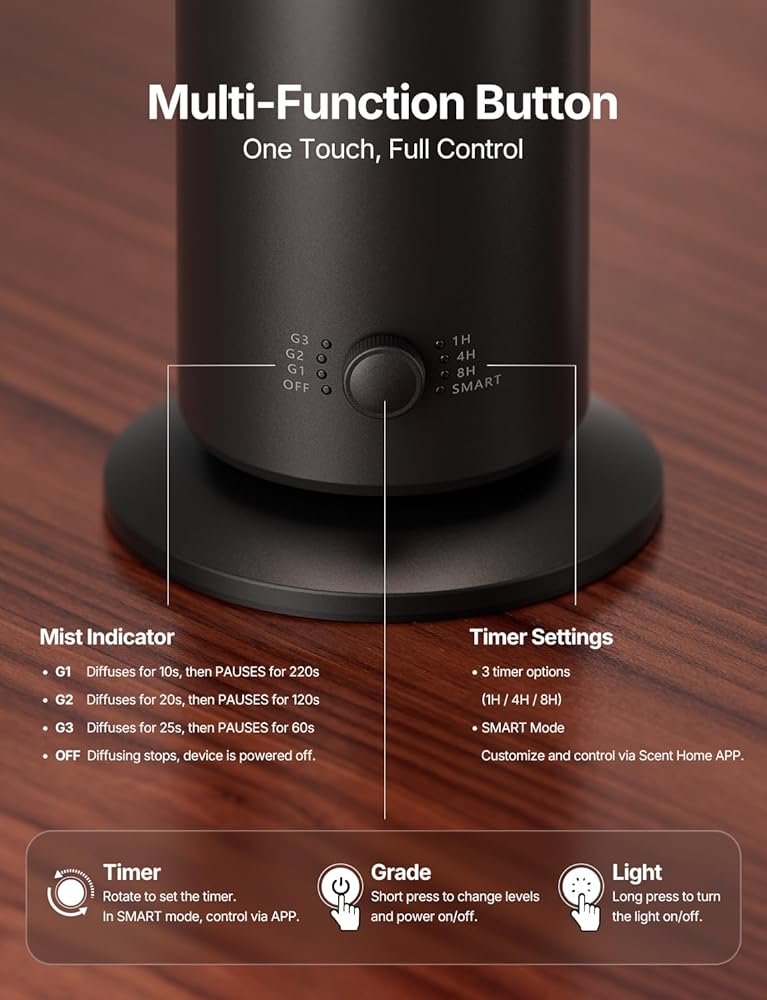 【Smart App and Manual Control】Control your aromatherapy diffuser with two convenient options. In manual mode, press the power button to switch between three mist levels, and rotate the knob to choose three timer settings. For advanced control, connect through the Scent Home App (iOS and Android) via Bluetooth to create customized schedules and timers. For stable connection, keep your phone within 30 ft (10 m) of the air diffuser.