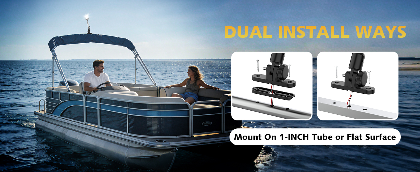 1-Inch Tube Mounting: This pontoon anchor light is designed for bimini tops mounting on 1-Inch round/square tubes with included brackets; the versatile base also accommodates flat surfaces for flexible installation on any boats