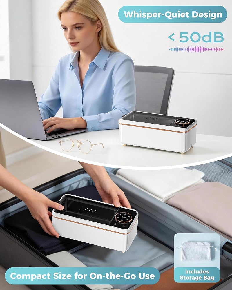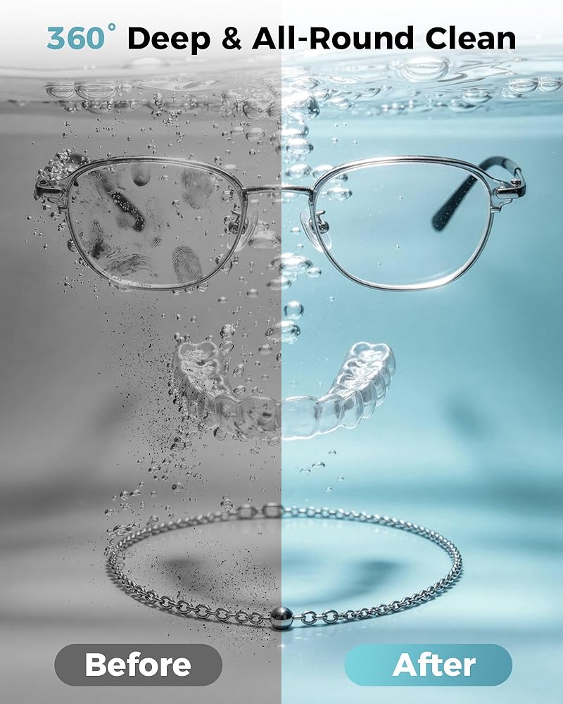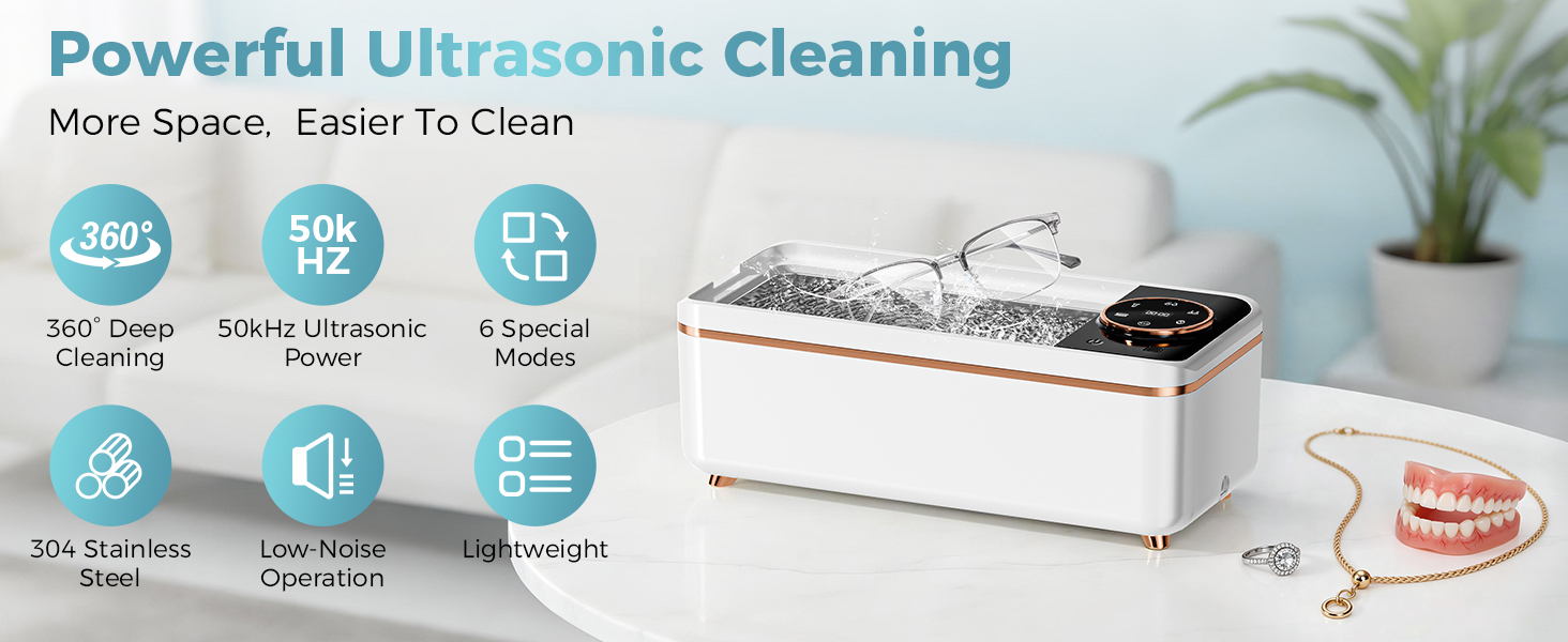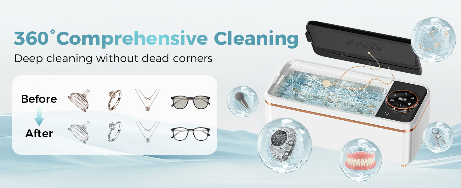 [50kHz Ultrasonic Cleaning]: This ultrasonic jewelry cleaner uses 50,000-55,000Hz high-frequency waves. The high-frequency vibrations separate air and water, forming microbubbles that remove surface stains. (Note: It does not remove rust.)