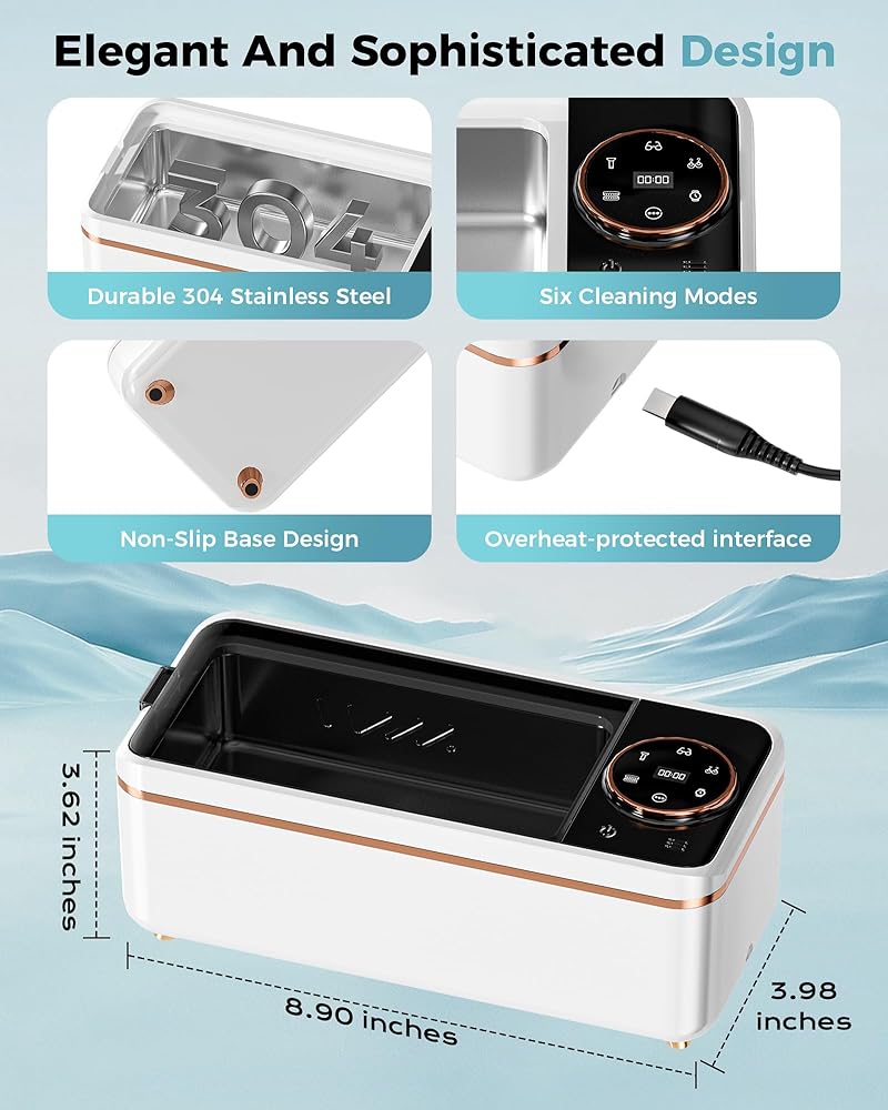 [Upgraded Multi-Mode]: Our jewelry cleaner features six cleaning modes: 8-min Default, 5-min Dentures, 3-min Jewelry, 5-min Eyes, 3-min Earrings, and 3-min Watch. This prevents over-cleaning of some items and prevents deformation or debonding due to prolonged ultrasonic exposure. (For optimal cleaning results, please use with a detergent.)