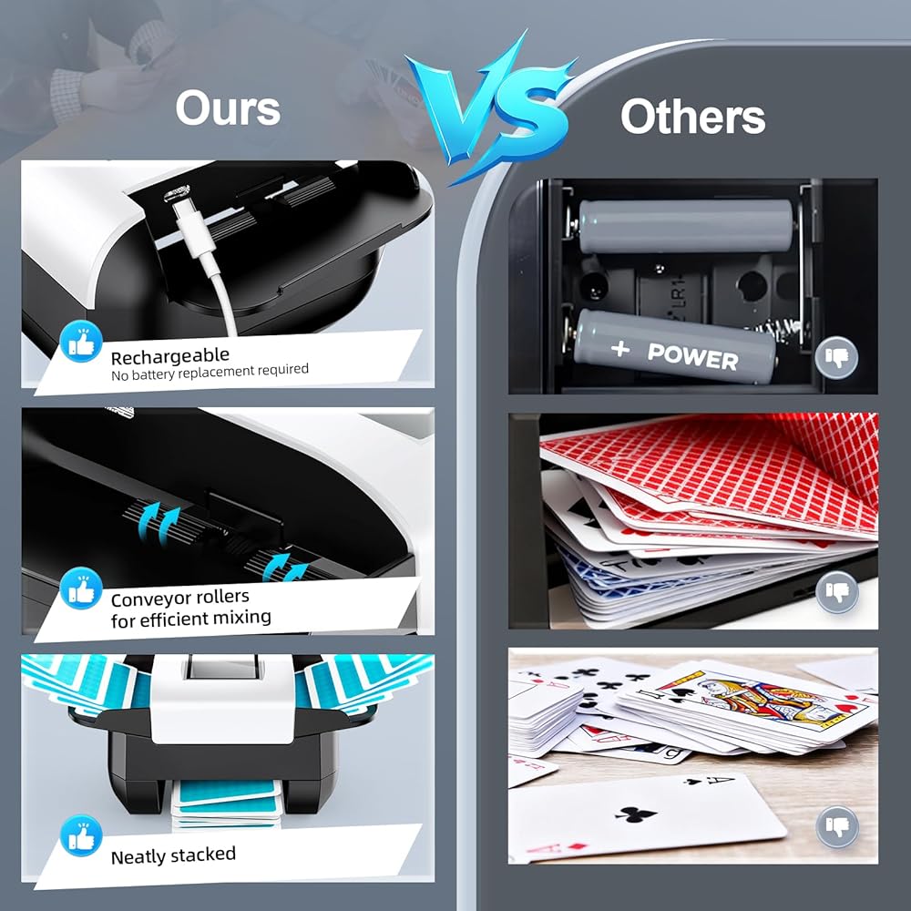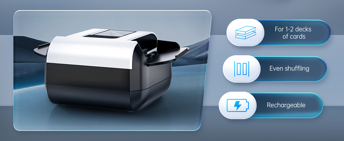 • Built-in Rechargeable Battery – No need to purchase disposable batteries. Equipped with a 2000mAh lithium rechargeable battery, this shuffler is eco-friendly, cost-saving, and ready to use anytime after a quick charge. Includes a USB charging cable for convenience.